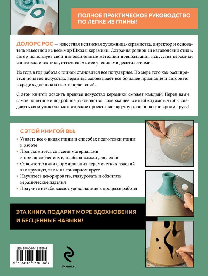 Известная испанская художница-керамистка, директор и основатель известной на весь мир Школы керамики, Долорс Рос, представляет полное и доступное пошаговое руководство по освоению одного из самых популярных видов творчества — гончарного мастерства.