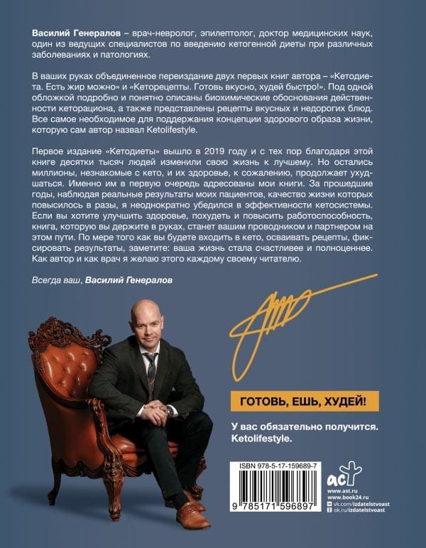 В ваших руках объединенное переиздание двух первых книг автора – «Кетодиета. Есть жир можно!» и «Кеторецепты. Готовь вкусно, худей быстро!». Под одной обложкой подробно и понятно описаны биохимические обоснования действенности кеторациона, а также представлены рецепты вкусных и недорогих блюд. Все самое необходимое для поддержания концепции здорового образа жизни, которую сам автор назвал Ketolifestyle. Первое издание «Кетодиеты» вышло в 2019 году, и с тех пор благодаря этой книге десятки тысяч людей изменили свою жизнь к лучшему. Но остались миллионы, не знакомые с кето, и их здоровье, к сожалению, продолжает ухудшаться. Именно им, в первую очередь, адресованы мои книги. За прошедшие годы, наблюдая реальные результаты моих пациентов, качество жизни которых повысилось в разы, я неоднократно убедился в эффективности кетосистемы. Если вы хотите улучшить здоровье, похудеть и повысить работоспособность, — книга, которую вы держите, станет вашим проводником и партнером на этом пути. По мере того как вы будете входить в кето, осваивать рецепты, фиксировать результаты, заметите: ваша жизнь стала счастливее и полноценнее. Как автор и как врач я желаю этого каждому своему читателю.