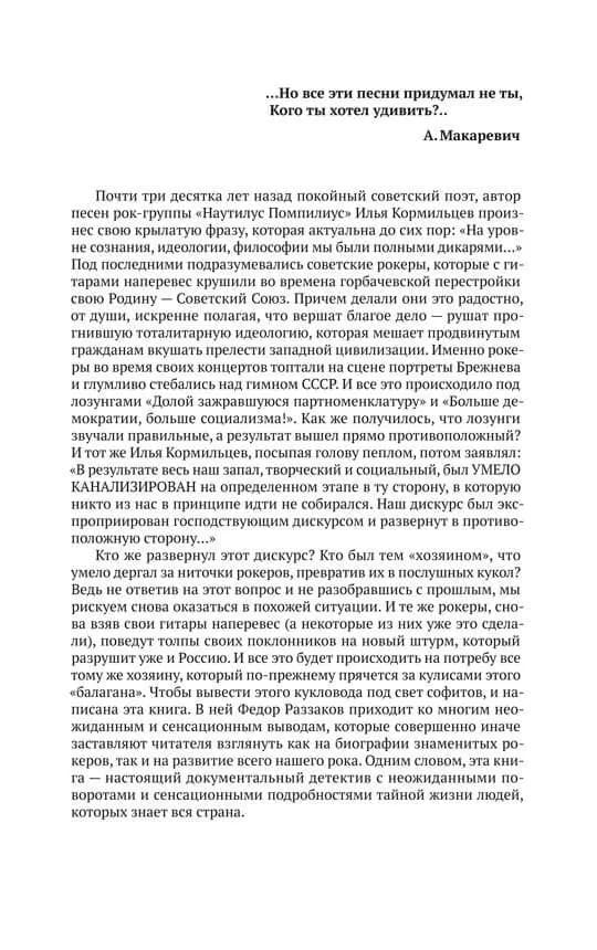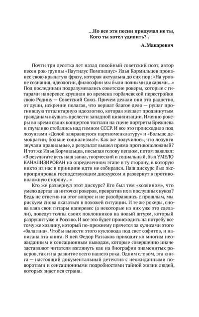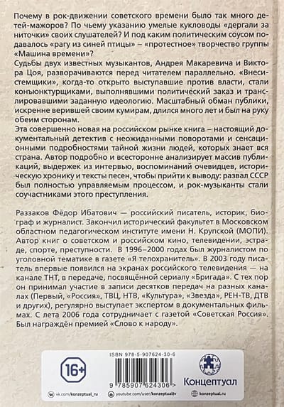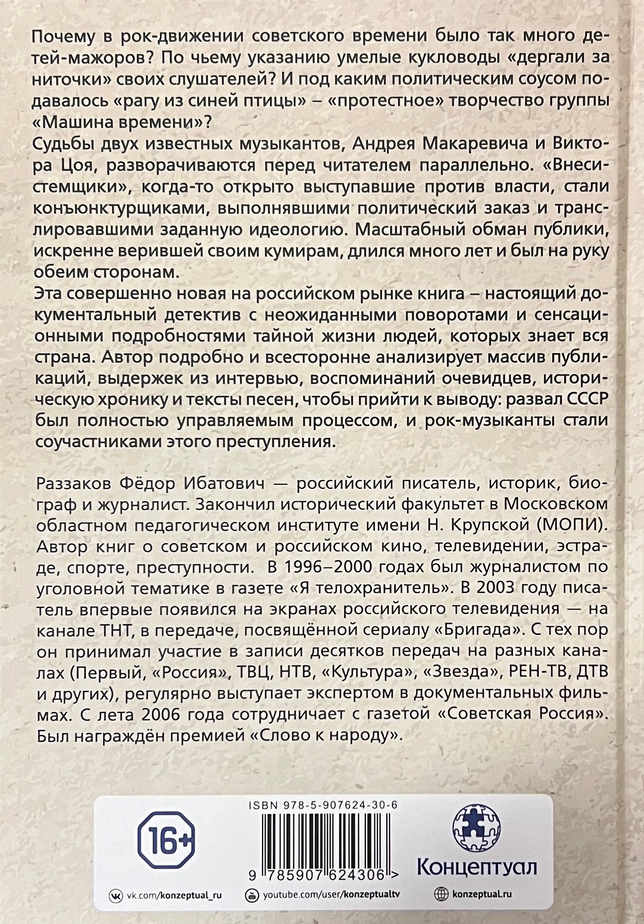 Почему в рок-движении советского времени было так много детей-мажоров? По чьему указанию умелые кукловоды «дергали за ниточки» своих слушателей? И под каким политическим соусом подавалось «рагу из синей птицы» – «протестное» творчество группы «Машина времени»? Судьбы двух известных музыкантов, Андрея Макаревича и Виктора Цоя, разворачиваются перед читателем параллельно. «Внесистемщики», когда-то открыто выступавшие против власти, стали конъюнктурщиками, выполнявшими политический заказ и транслировавшими заданную идеологию. Масштабный обман публики, искренне верившей своим кумирам, длился много лет и был на руку обеим сторонам. Эта совершенно новая на российском рынке книга – настоящий документальный детектив с неожиданными поворотами и сенсационными подробностями тайной жизни людей, которых знает вся страна.