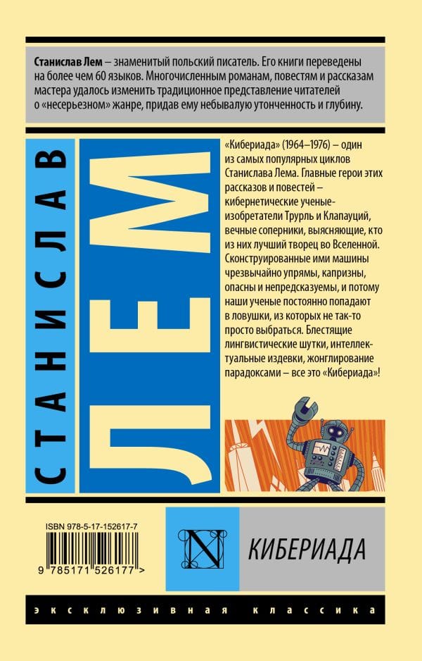 Кибериада (1964 – 1976) – один из самых популярных циклов Станислава Лема. Главные герои этих рассказов и повестей – кибернетические ученые-изобретатели Трурль и Клапауций, вечные соперники, выясняющие, кто из них лучший творец во Вселенной. Сконструированные ими машины чрезвычайно упрямы, капризны, опасны и непредсказуемы, и потому наши ученые постоянно попадают в ловушки, из которых не так-то просто выбраться. Блестящие лингвистические шутки, интеллектуальные издевки, жонглирование парадоксами – все это «Кибериада»!