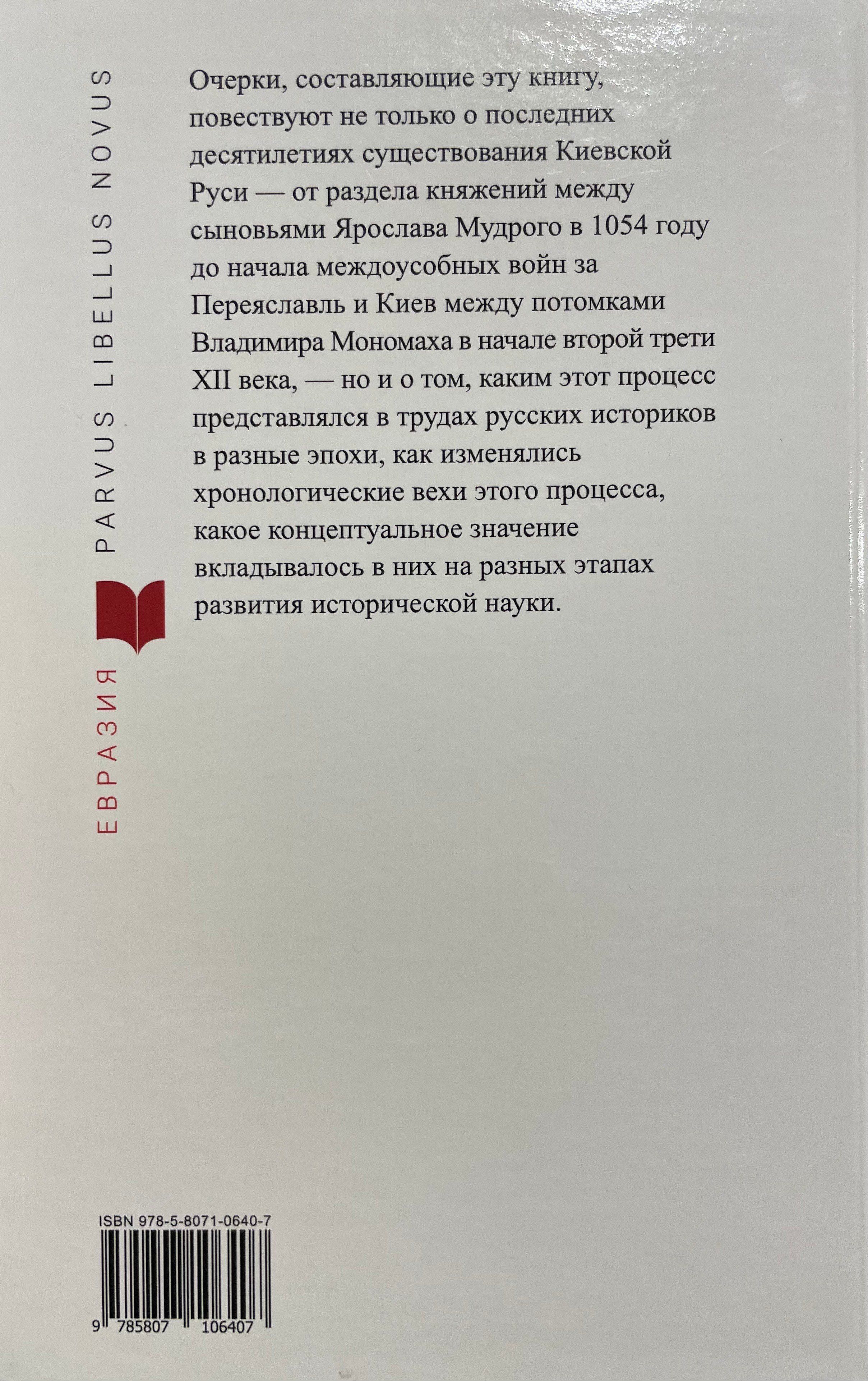 Очерки, составляющие эту книгу, повествуют не только о последних десятилетиях существования Киевской Руси — от раздела княжений между сыновьями Ярослава Мудрого в 1054 году до начала междоусобных войн за Переяславль и Киев между потомками Владимира Мономаха в начале второй трети XII века, — но и о том, каким этот процесс представлялся в трудах русских историков в разные эпохи, как изменялись хронологические вехи этого процесса, какое концептуальное значение вкладывалось в них на разных этапах развития исторической науки.
