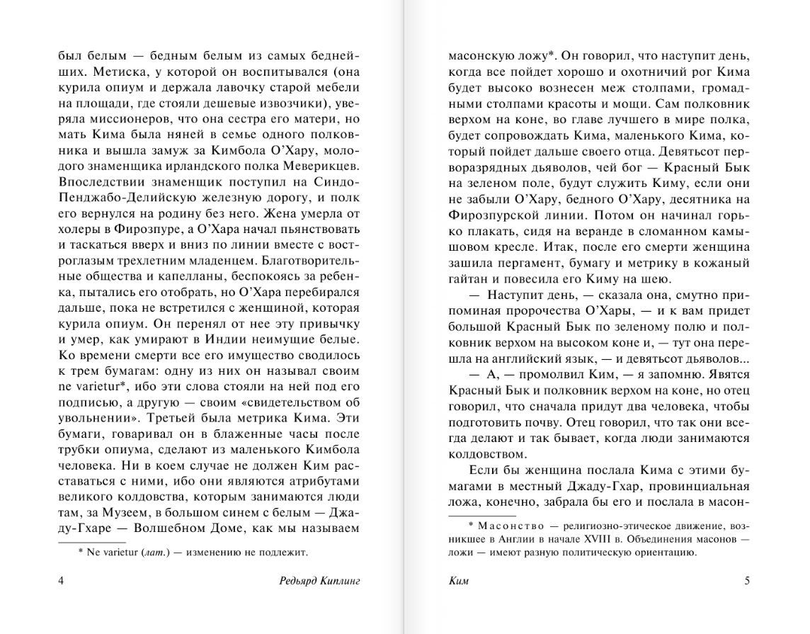 «Ким» объединяет в себе черты «романа воспитания», увлекательного шпионского детектива, философской притчи и приключенческого романа. Киплинг переносит читателя в неповторимый и экзотичный мир Индии конца XIX века и рассказывает о судьбе осиротевшего ирландского мальчика, воспитанного индианкой, Кима О'Хара, который с малых лет зарабатывал на жизнь попрошайничеством и мелкими поручениями на улицах Лахора. Мальчик по воле судьбы знакомится с мудрым буддистским монахом, становится его учеником и отправляется вместе с ним путешествовать по стране. Кима ждут опасные приключения, политические интриги, смертельные схватки и участие в невидимой многим Большой игре…