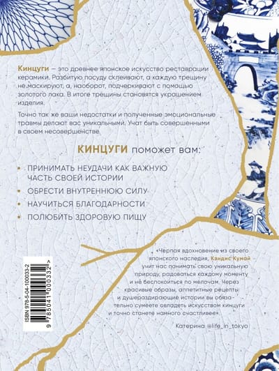 Кинцуги - древнее японское искусство реставрации разбитых вещей. Его суть в том, что поломки и трещины неотделимы от истории самой вещи. Их нужно не скрывать, а, наоборот, выставлять в лучшем свете. Трещины становятся золотыми лучами, пересекающими изделие. Точно так же полученные травмы, делают вас уникальными. Учат быть совершенной в своем несовершенстве.