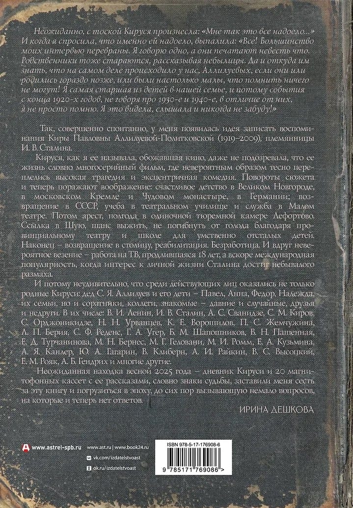 Так появилась идея записать воспоминания Киры Павловны Аллилуевой-Политковской (1919—2009), племянницы И. В. Сталина. Неожиданная находка весной 2025 года — дневник Кируси и ее рассказы, словно знаки судьбы, заставили меня сесть за эту книгу и погрузиться в эпоху, до сих пор вызывающую немало вопросов, на которые и теперь нет ответов.