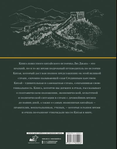 Книга известного китайского историка Лю Чжана — это краткий, но в то же время подробный путеводитель по истории Китая, который даст вам полное представление об истории этой великой страны, которая скромно называет себя Центральным (Серединным) Государством. Китай — удивительная и самобытная страна, которой удалось сохранить свою уникальность. История Китая с древнейших времен и до наших дней показывает, как ее географическое положение, экономическая, культурная и политическая ситуации влияли на развитие страны, рассказывает о знаменитых китайцах — правители, военачальники, ученые, — которые в разное время и очень по-разному утверждали ее место в мире.
