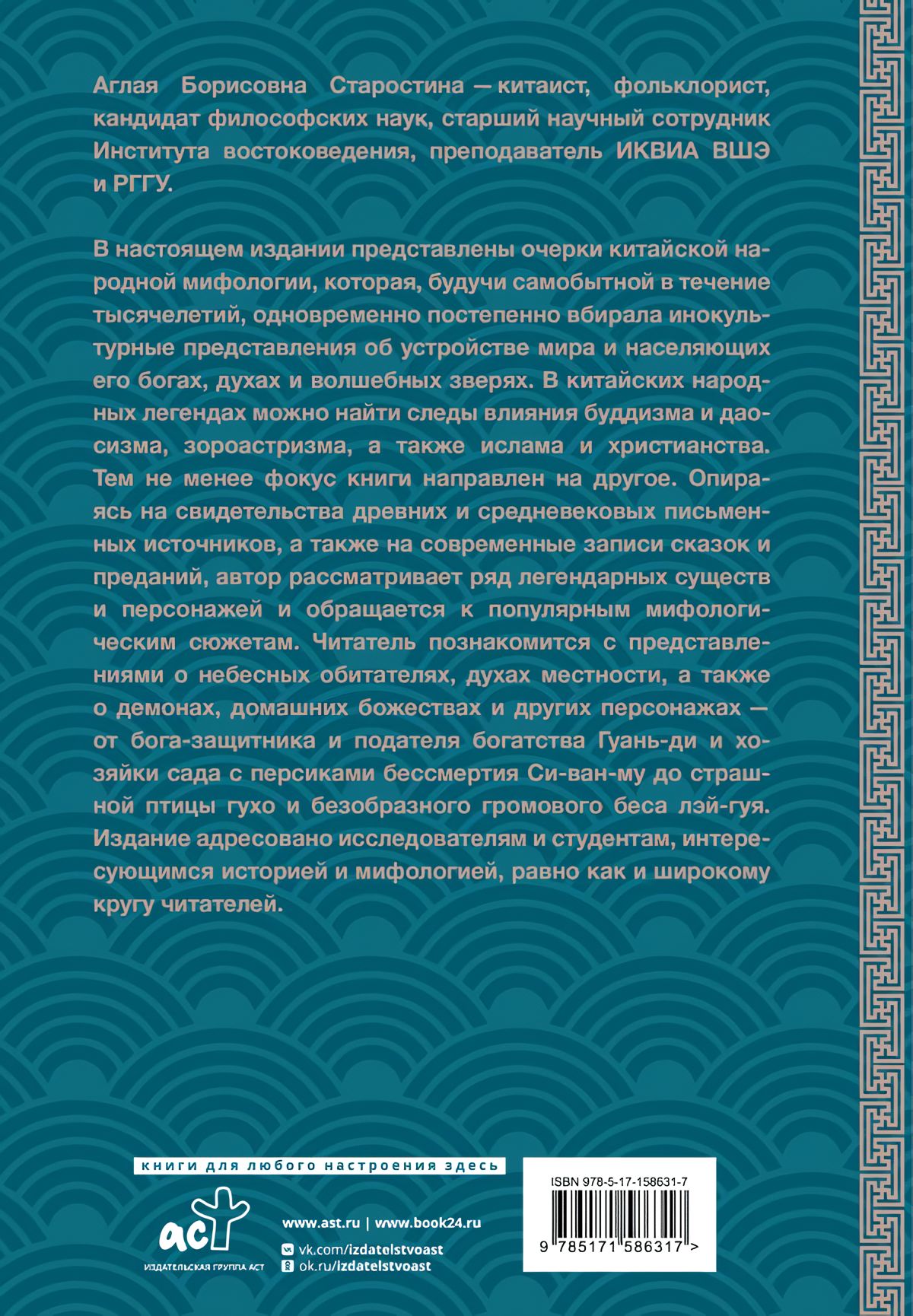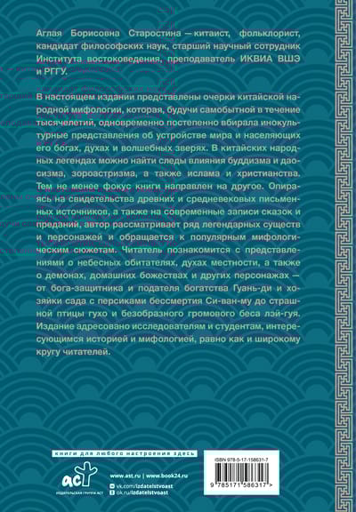 В настоящем издании представлены очерки китайской народной мифологии, которая, будучи самобытной в течение тысячелетий, одновременно постепенно вбирала инокультурные представления об устройстве мира и населяющих его богах, духах и волшебных зверях. В китайских народных легендах можно найти следы влияния буддизма и даосизма, зороастризма, а также ислама и христианства. Тем не менее фокус книги направлен на другое. Опираясь на свидетельства древних и средневековых письменных источников, а также на современные записи сказок и преданий, автор рассматривает ряд легендарных существ и персонажей и обращается к популярным мифологическим сюжетам. Читатель познакомится с представлениями о небесных обитателях, духах местности, а также о демонах, домашних божествах и других персонажах — от бога-защитника и подателя богатства Гуань-ди и хозяйки сада с персиками бессмертия Си-ван-му до страшной птицы гухо и безобразного громового беса лэй-гуя. Издание адресовано исследователям и студентам, интересующимся историей и мифологией, равно как и широкому кругу читателей.