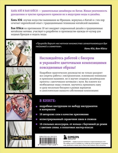 Подробные инструкции и детальные иллюстрации помогут вам легко и просто освоить все необходимые виды стежков и научиться пришивать одну или сразу несколько бисерин в разных вариантах. Пошаговые мастер-классы помогут создать 16 стильных изделий — от кольца с баугинией до ремня с цветами сливы. Наслаждайтесь работой с бисером и украшайте цветочными композициями повседневные образы!