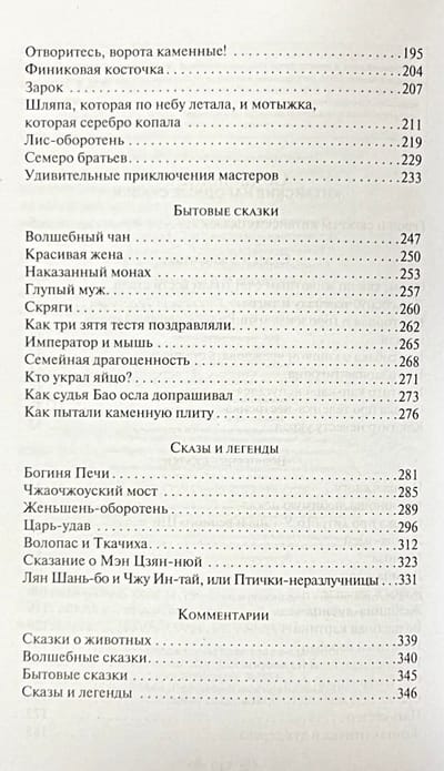 Наша книга познакомит вас с некоторыми из этих сказок. Среди них есть сказки о животных, где наравне с людьми персонажами выступают птицы и звери. В сборник вошли также волшебные сказки, в которых реальность тесно переплетена с вымыслом. И, наконец, вы прочтёте бытовые сказки, повествующие о жизни и нравах китайского народа.