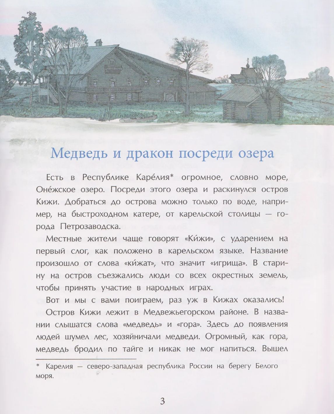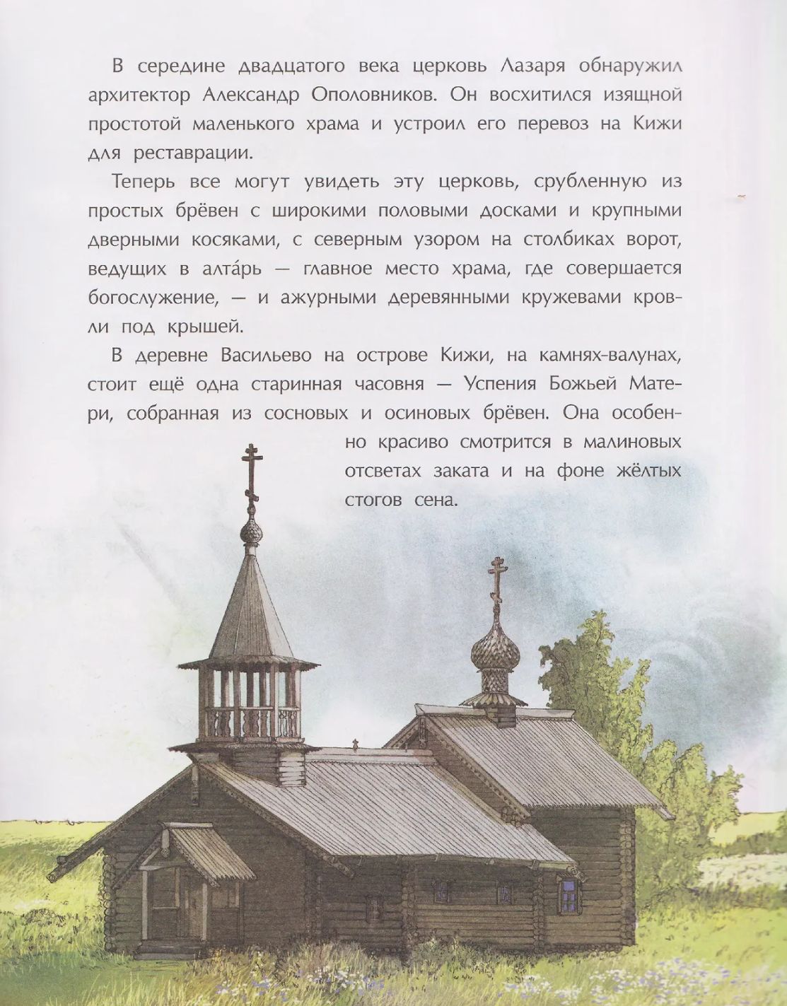Кижи — музей под открытым небом. Это небольшой остров, где собраны деревянные постройки, привезённые с разных концов севера России. Старинные мельницы и сегодня крутят лопастями-крыльями. Искусные мастера вырезают топором затейливые наличники для деревянных окон. Деревянные церкви устремили вверх свои купола-маковки. На этом чудо-острове живут не только люди, но и сказки.