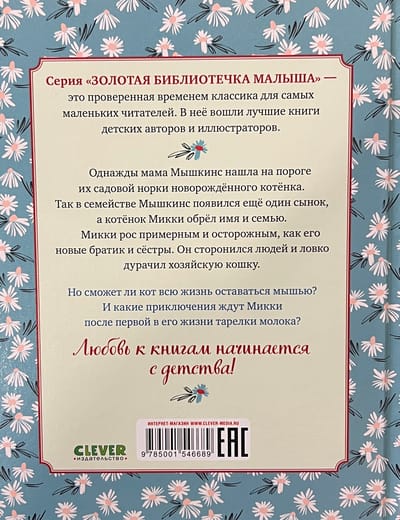 Однажды мама Мышкинс нашла на пороге их садовой норки новорожденного котенка. Так в семействе Мышкинс появился еще один сынок, а котенок Микки обрел имя и семью. Микки рос примерным и осторожным, как его новые братик и сестры. Он сторонился людей и ловко дурачил хозяйскую кошку. Но сможет ли кот всю жизнь оставаться мышью? И какие приключения ждут Микки после первой в его жизни тарелки молока?
