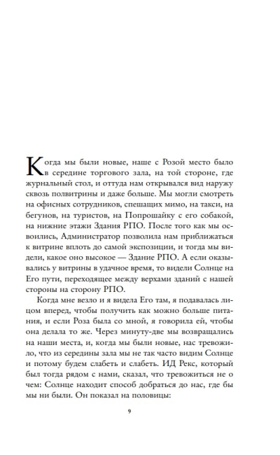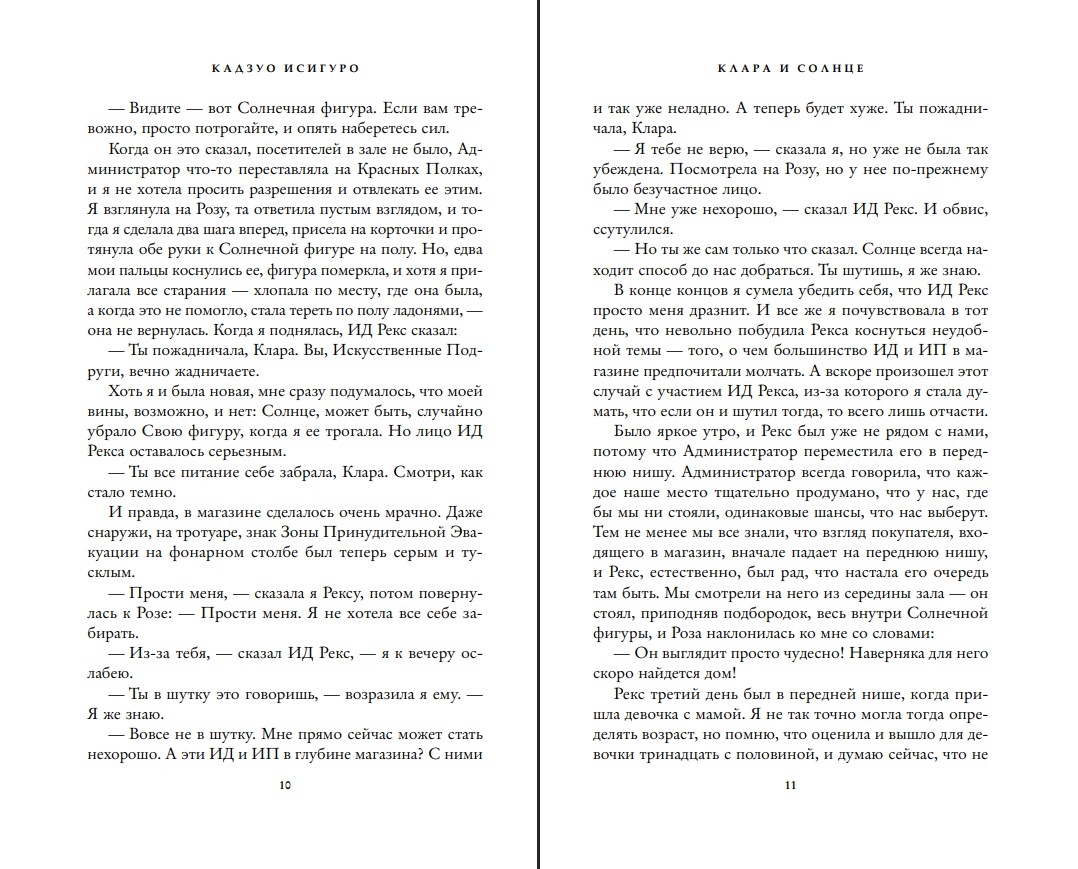 Клара совсем новая. С заразительным любопытством из-за широкого окна витрины она впитывает в себя окружающий мир — случайных прохожих, проезжающие машины и, конечно, живительное Солнце. Клара хочет узнать и запомнить как можно больше — так она сможет стать лучшей Искусственной Подругой своему будущему подростку От того, кто выберет Клару, будет зависеть ее судьба. Чистый, отчасти наивный взгляд на реальность, лишь слегка отличающуюся от нашей собственной, — вот, что дарит новый роман Кадзуо Исигуро. Каково это — любить? И можно ли быть человеком, если ты не совсем человек? История, рассказанная с обескураживающей искренностью, заставит вас по-новому ответить на эти вопросы.