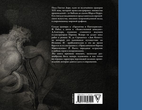 Создав гравюры к "Гаргантюа и Пантагрюэлю" Ф. Рабле, а затем к "Божественной комедии" Д. Алигьери, художник становится ведущим иллюстратором Парижа. Вскоре он делает цикл работ к роману М. де Сервантеса "Дон Кихот", на который его вдохновило путешествие по Испании. И  приблизительно в это же время берется за иллюстрации к "Приключениям барона Мюнхгаузена" Р. Распе, отражая остроумие и любовь героя к импровизации. Эта книга призвана показать, насколько разнообразна была манера художника и как точно он отражал характеры персонажей великих произведений, которые даются здесь в сокращении.