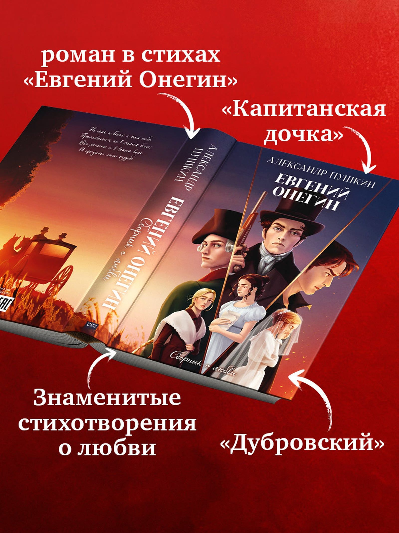 Культовая классика для современных читателей: роман в стихах «Евгений Онегин», романы «Капитанская дочка», «Дубровский» и стихотворения Пушкина о любви в стильном оформлении Trendbooks.