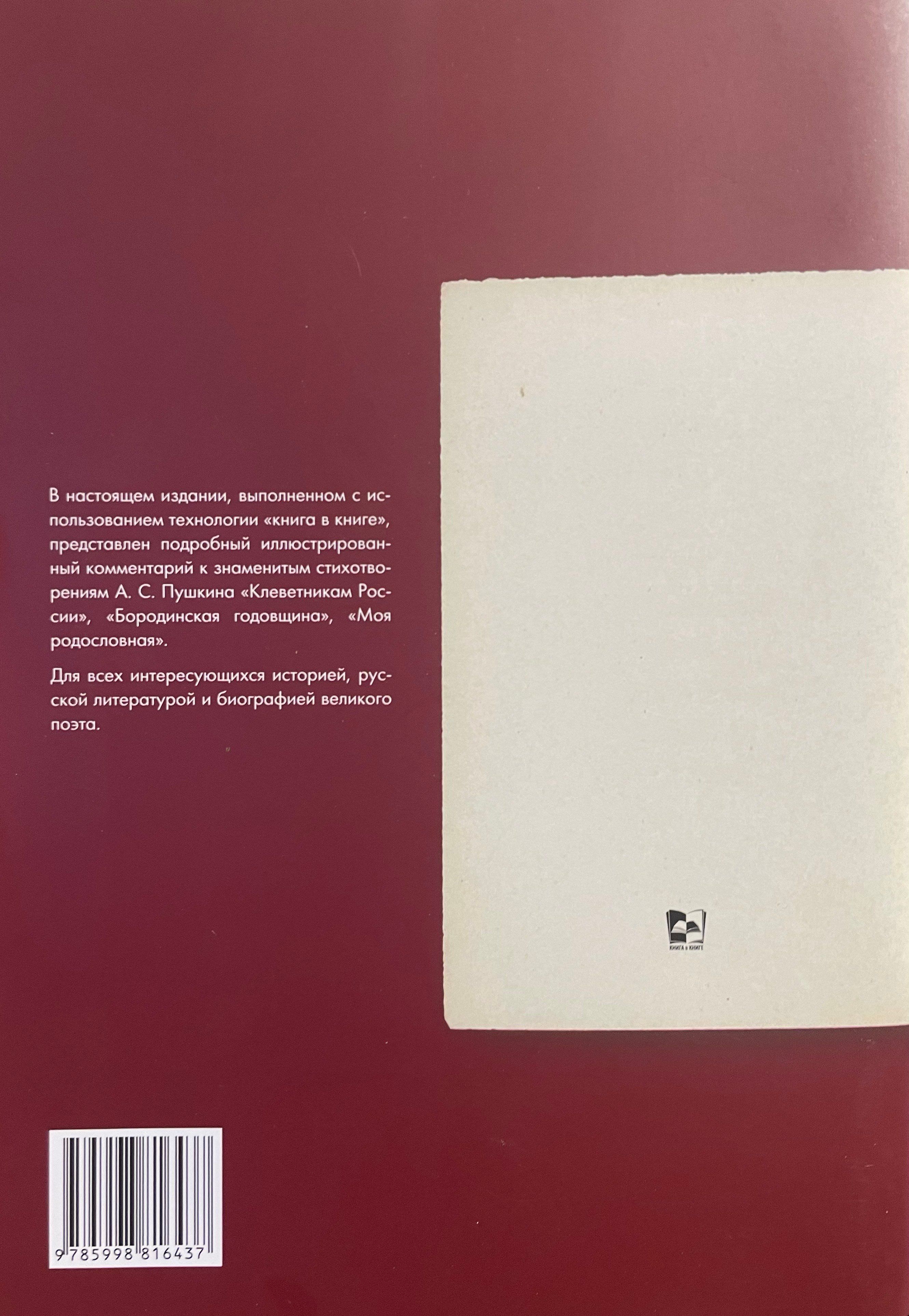 В настоящем издании, выполненном с использованием технологии «книга в книге», представлен подробный иллюстрированный комментарий к знаменитым стихотворениям А. С. Пушкина «Клеветникам России», «Бородинская годовщина», «Моя родословная». Для всех интересующихся историей, русской литературой и биографией великого поэта.