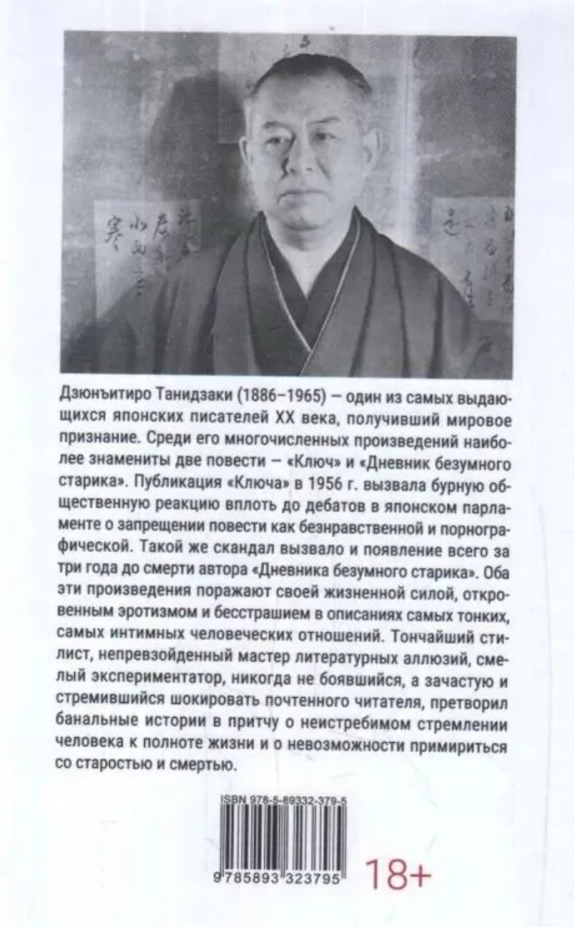 Танидзаки Дзюнъитиро (1886-1965) - один из самых выдающихся японских писателей XX века, получивший мировое признание. Среди его многочисленных произведений наиболее знамениты два романа - «Ключ» и «Дневник безумного старика». Публикация «Ключа» в 1956 г. вызвала бурную общественную реакцию вплоть до дебатов в японском парламенте о запрещении романа как безнравственного и порнографического. Такой же скандал вызвало и появление всего за три года до смерти автора «Дневника безумного старика». Оба эти произведения поражают своей жизненной силой, откровенным эротизмом и бесстрашием в описаниях самых тонких, самых интимных человеческих отношений. Тончайший стилист, непревзойденный мастер литературных аллюзий, смелый экспериментатор, никогда не боявшийся, а зачастую и стремившийся шокировать почтенного читателя, претворил банальные истории в притчу о неистребимом стремлении человека к полноте жизни и о невозможности примириться со старостью и смертью.