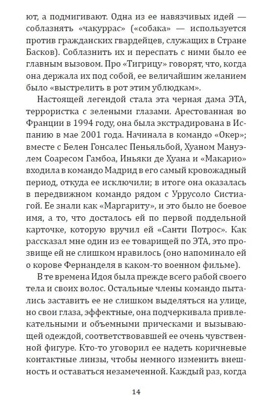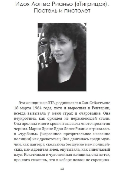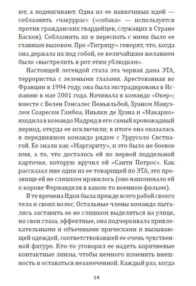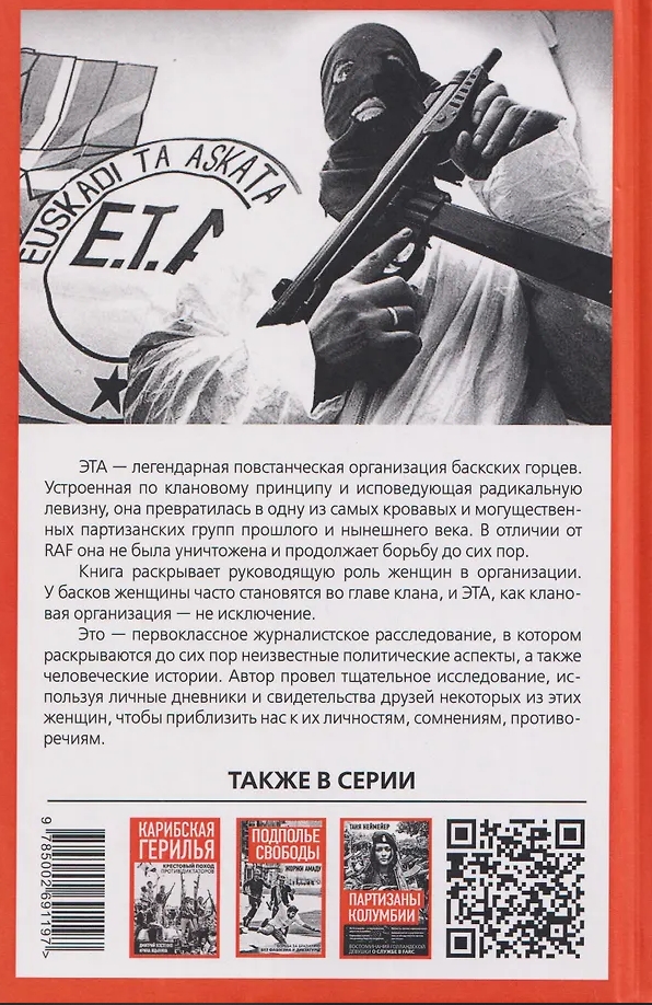 ЭТА — легендарная повстанческая организация баскских горцев. Устроенная по клановому принципу и исповедующая радикальную левизну, она превратилась в одну из самых кровавых и могущественных партизанских групп прошлого и нынешнего века. В отличии от RAF она не была уничтожена и продолжает борьбу до сих пор. Эта книга раскрывает руководящую роль женщин в организации. У басков женщины часто становятся во главе клана, и ЭТА, как клановая организация, была полна женщинами во главе. Это — первоклассное журналистское расследование, в котором раскрываются до сих пор неизвестные политические аспекты, а также человеческие истории. Автор провел тщательное исследование, используя личные дневники и свидетельства друзей некоторых из этих женщин, чтобы приблизить нас к их личностям, сомнениям, противоречиям.