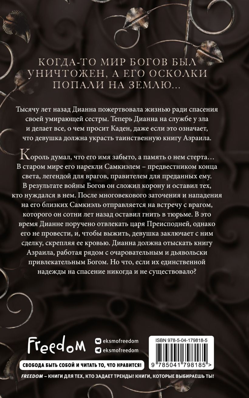 Когда-то мир Богов был уничтожен, а его осколки попали на Землю… Тысячу лет назад Дианна пожертвовала жизнью ради спасения своей умирающей сестры. Она взывала ко всем, кто был готов помочь, не ожидая, что призовет могущественное чудовище, которое хуже любого кошмара. Теперь Дианна на службе у зла и делает все, о чем просит Каден, даже если это означает, что девушка должна украсть таинственную книгу Азраила. Король думал, что его имя забыто, а память о нем стерта… В старом мире его нарекли Самкиэлем. В новом его имя Лиам, но одно осталось неизменным – он предвестник конца света, легенда для врагов, правитель для преданных ему. После войны Богов он скрылся от мира, сложил корону и оставил тех, кто нуждался в нем больше всего, выживать на умирающей земле. После многовекового заточения и нападения на его близких, Самакиэль отправляется на встречу с врагом, которого он сотни лет назад оставил гнить в тюрьме. В это время Дианне поручено отвлекать царя Преисподней, однако, его не провести, и, чтобы выжить, девушка заключает с ним сделку, скрепляя ее кровью. Дианна должна отыскать книгу Азраила, работая рядом с очаровательным и дьявольски привлекательным Богом. Но что если их единственной надежды на спасение никогда и не существовало? Цитата, после которой вы захотите узнать больше: «Я не помню, как долго мы разговаривали, но где-то между ее смехом и улыбкой я решил, что ради нее я разорву этот мир на части».