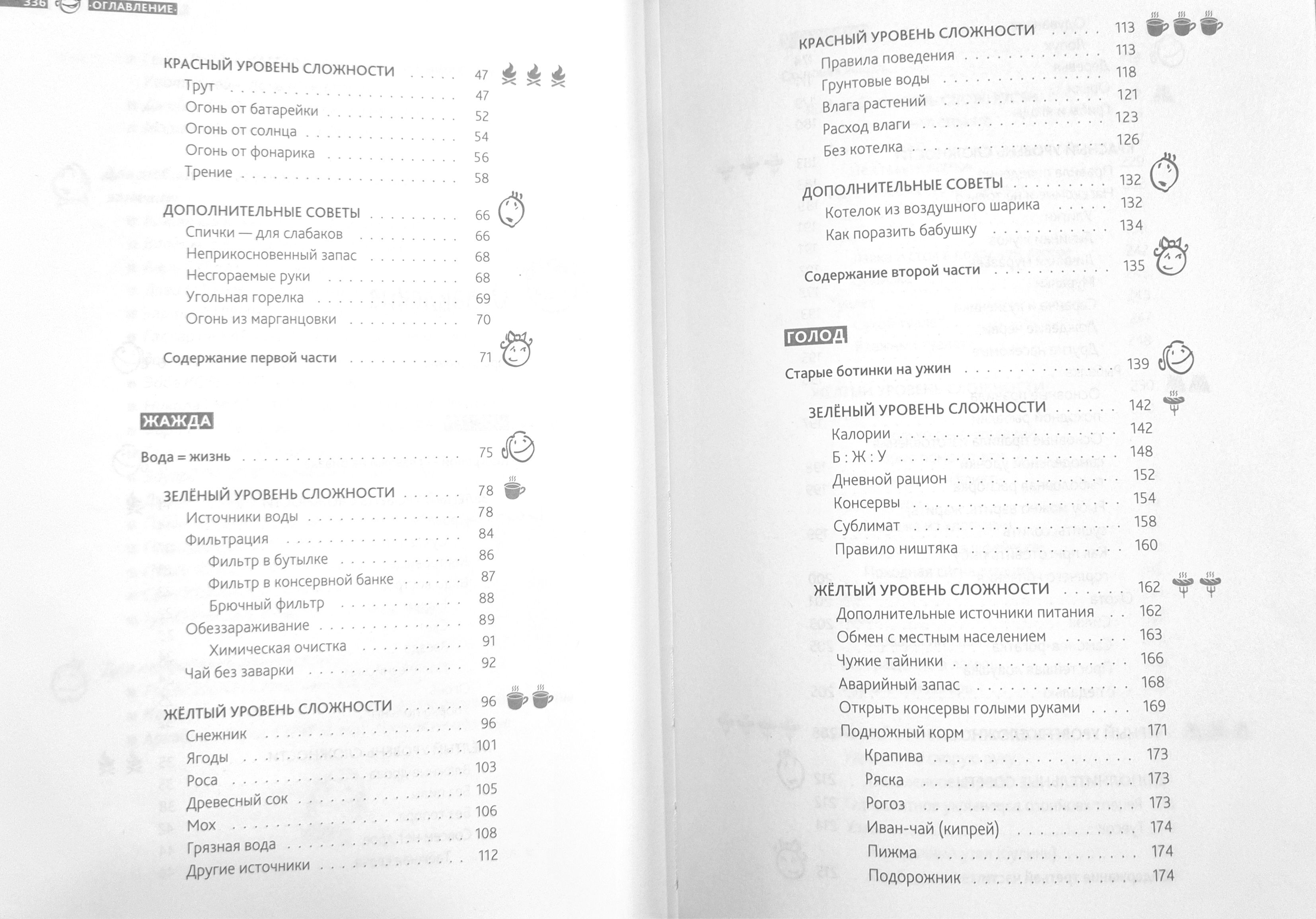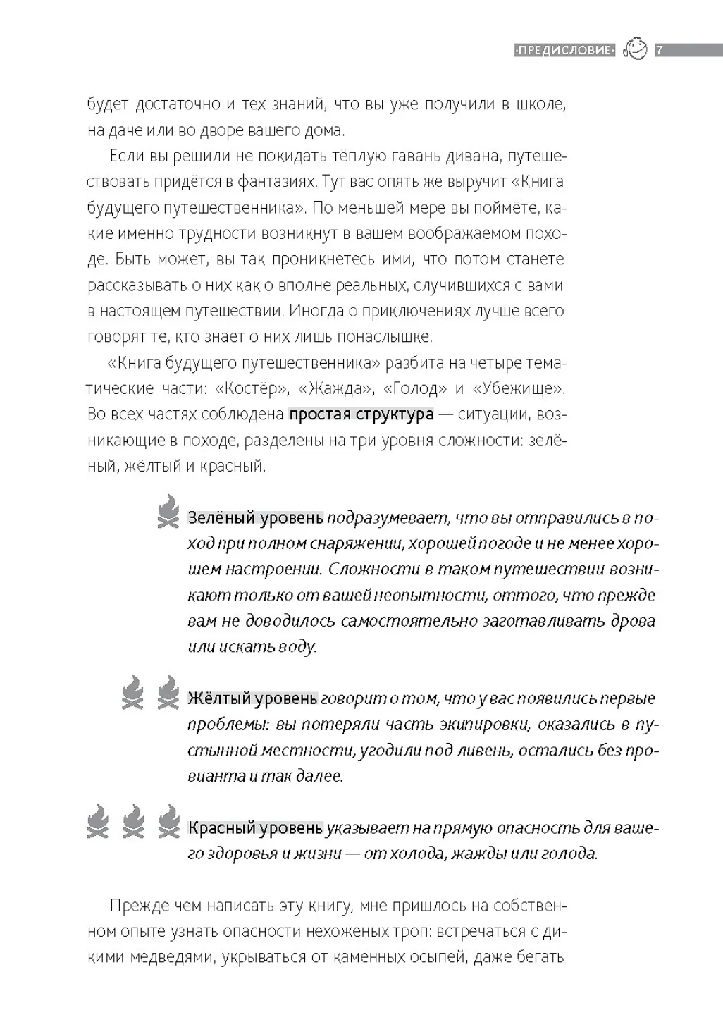 «Книга будущего путешественника» — это увлекательнейшая энциклопедия знаний и умений, которые будут полезны и на семейном пикнике, и в настоящем походе. Она содержит четыре больших части: «Костер», «Жажда», «Голод» и «Убежище». Каждая из них описывает три уровня сложностей, которые ждут всякого путешественника.
