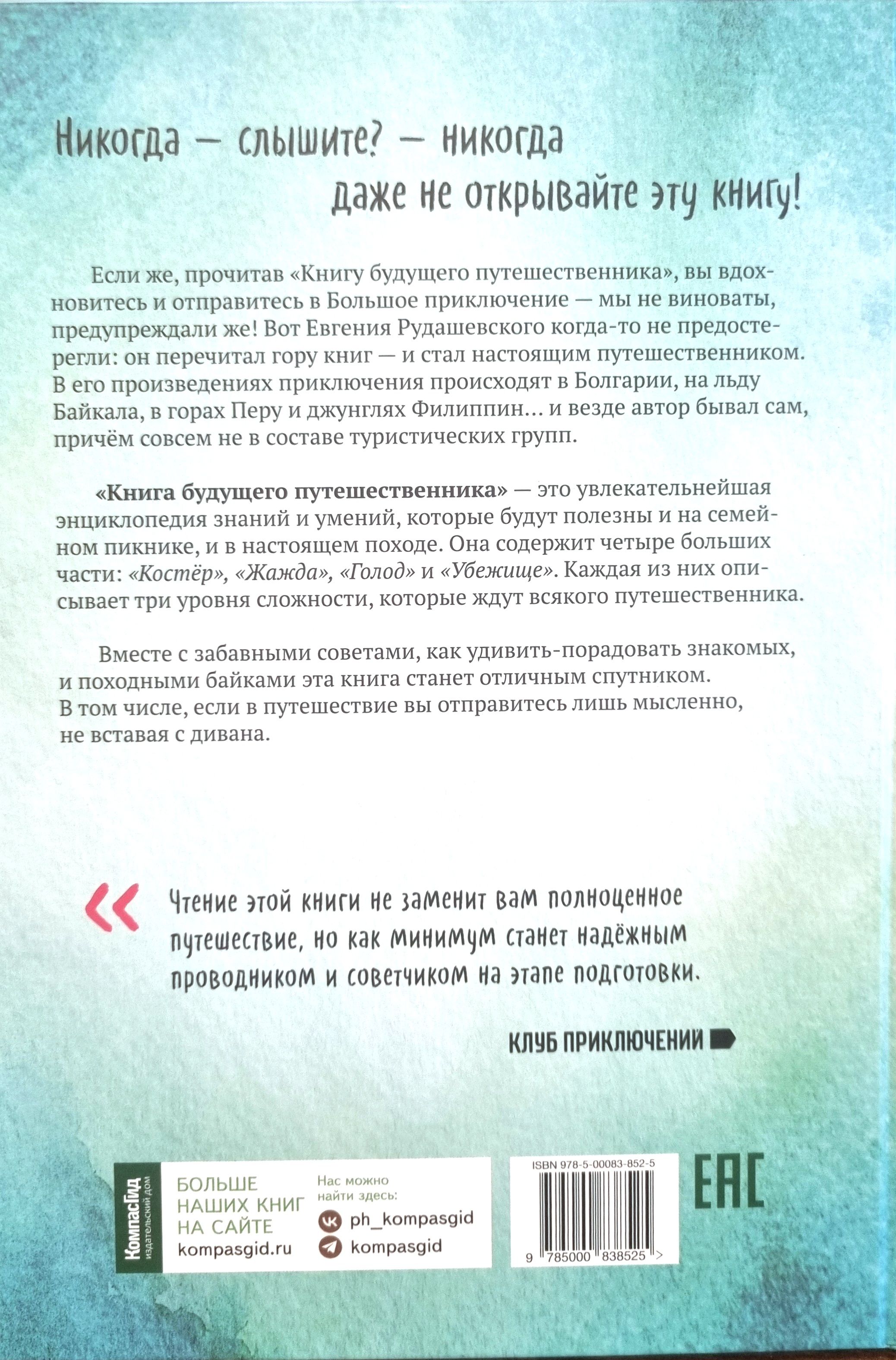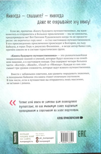 Никогда — слышите? — никогда даже не открывайте эту книгу! А если, прочитав «Книгу будущего путешественника», вы вдохновитесь и отправитесь в Большое приключение — мы не виноваты, предупреждали же! Вот Евгения Рудашевского когда- то не предостерегли: он перечитал гору книг — и стал настоящим путешественником. И ещё — писателем: в его произведениях приключения происходят в Болгарии, на льду Байкала, в горах Перу и джунглях Филиппин… и везде автор бывал сам, причем совсем не в составе туристических групп.