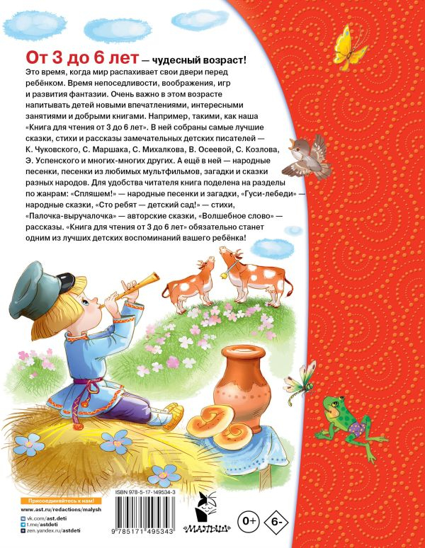 От 3 до 6 лет – чудесный возраст! Это время, когда мир распахивает свои двери перед ребёнком. Время непоседливости, воображения, игр и развития фантазии. Очень важно в этом возрасте напитывать детей новыми впечатлениями, интересными занятиями и добрыми книгами. Например, такими, как наша «Книга для чтения от 3 до 6 лет». В ней собраны самые лучшие сказки, стихи и рассказы замечательных детских писателей – К. Чуковского, С. Маршака, С. Михалкова, В. Осеевой, С. Козлова, Э. Успенского и многих-многих других. А ещё в ней – народные песенки, песенки из любимых мультфильмов, загадки и сказки разных народов. «Книга для чтения от 3 до 6 лет» обязательно станет одним из лучших детских воспоминаний вашего ребёнка!