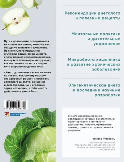 Начать путь к долголетию можно в любом возрасте — и в 25, и в 35, и в 65 лет. На страницах этой книги каждый получит стратегию сохранения молодости и сможет выстроить не только собственный рацион, но и образ жизни. Как сохранить мышечную массу и предотвратить остеопороз? Можно ли улучшить микробиоту кишечника и избежать развития хронических заболеваний? Влияет ли повседневное питание на наши гены? Зачем нужна эпигенетическая диета? С чего начинается ожирение у детей? Как избежать перепадов настроения? Что такое теломеры и как они влияют на старение организма? Ответы на жизненно важные вопросы вы найдете в «Книге долголетия» эндокринолога Олега Ирышкина и нутрициолога Оксаны Бадьиной, написанной совместно с другими признанными специалистами - педиатрами, диетологами, онкологами.