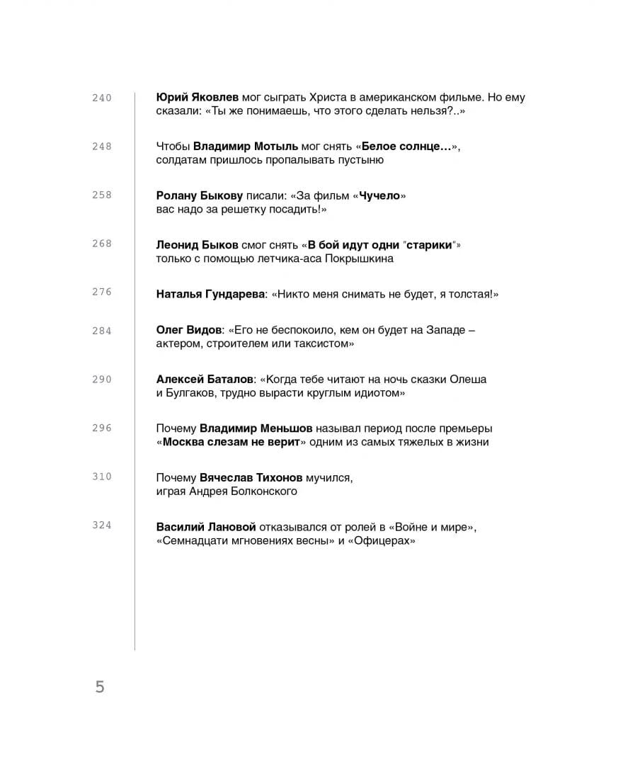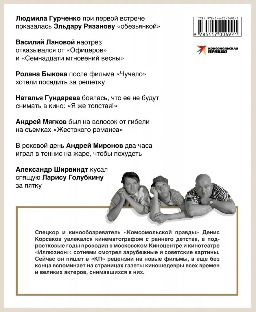 Гундарева всю жизнь сражалась с лишним весом и так и не решилась завести ребенка. Меньшов называл период после выхода «Москва слезам не верит» одним из тяжелейших в жизни, хотя фильм стал чемпионом проката. Бондарчук, прочитав в самолете статью о себе, захотел открыть дверь и выйти из лайнера «в открытый космос». И все же все они находили в жизни место для розыгрышей и авантюр, романов и расставаний. Быков, Никулин, Гурченко, Мягков, Леонов и многие другие звезды «с характером». Вы точно знаете всех героев нашей книги, но наверняка не знаете многого из того, что прочитаете в ней.