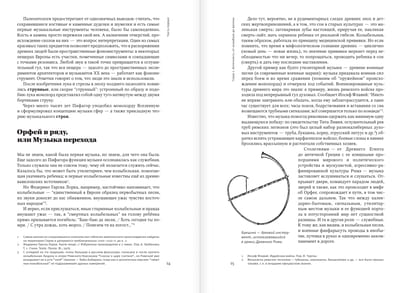 Заголовок «Книги о музыке» говорит сам за себя, но стоит сделать несколько уточнений, чтобы дать читателю более точное представление о тексте, с которым он будет иметь дело. Во-первых, «Книга о музыке» – это книга историческая, однако в ней вы не найдете ни дат, ни увесистых биографий. Она отражает историю развития идей и их влияния на творческие умы, показывает смену жанров и их взаимодействие. Во-вторых, это книга актуальная. Она рассказывает о музыкальном мире на сегодняшний день, посвящая читателя в тайны концертного и студийного звука, проводя его за кулисы фестивалей и в подвалы рекорд-студий. В-третьих, «Книга о музыке» показывает музыку во взаимодействии с другими видами искусства. В книге собраны монологи мастеров своего дела, которых объединяет одно – они не музыканты, но страстные меломаны. И, наконец, книга содержит в себе полезнейший справочник терминов и хронологическую таблицу, в которой отмечены музыкальные произведения рядом с современными им историческими событиями. В общем, «Книга о музыке» – уникальный сборник, охватывающий всю письменную музыкальную традицию от античности до наших дней и рассказывающий о ней не академическим, но поэтическим языком.