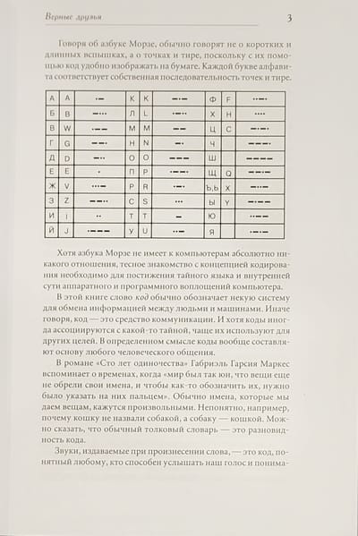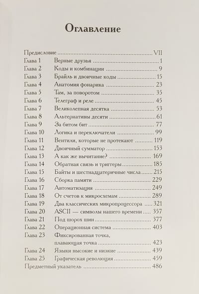 В книге Вы не найдете в ней ни подробных описаний операционных систем, ни указаний по работе со сложными компьютерными приложениями, ни тонкостей настройки оборудования, ни практического руководства по программированию. Эта книга - азбука компьютерных технологий. Шаг за шагом автор знакомит читателя с самой концепцией кодирования информации, рассказывает об истории возникновения компьютеров, на практических примерах помогает освоить основные концепции информационных технологий, подробно излагает принципы работы центрального процессора и некоторых других устройств компьютера. Книга написана живым, понятным, иногда ироничным языком, богато иллюстрирована, состоит из 25 глав, оглавления и предметного указателя. Книга адресована в первую очередь студентам вузов (как гуманитарных, так и технических), а также всем, кто интересуется концепциями создания и функционирования компьютеров.