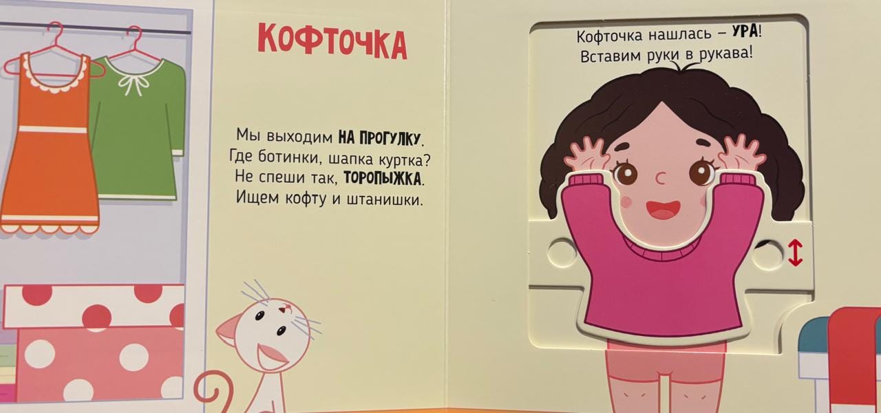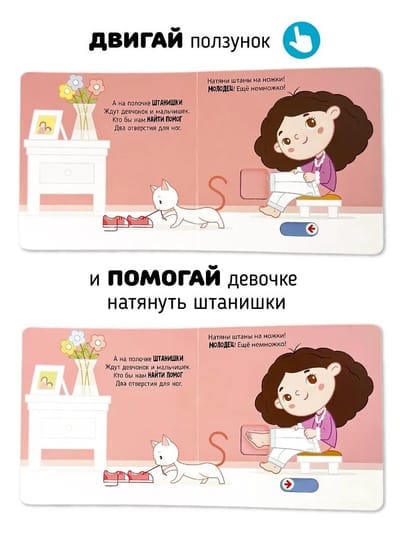 Развивающая книга для самых маленьких «Я учусь одеваться» из серии «Подвигай-ка» познакомит вашего малыша с удивительным миром самостоятельности и занимательного обучения. Детская развивашка будет интересна ребенку уже с полугода, а также с 1 года. С большими подвижными элементами, окошками, она станет идеальным спутником для первых шагов в освоении основ повседневной жизни. На прогулку собираясь, без подсказок я стараюсь все надеть как на картинке: кофту, штаники, ботинки. Книжка-малышка включает 5 крупных интерактивных элементов и простые задания, которые делают процесс чтения увлекательным.