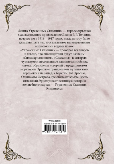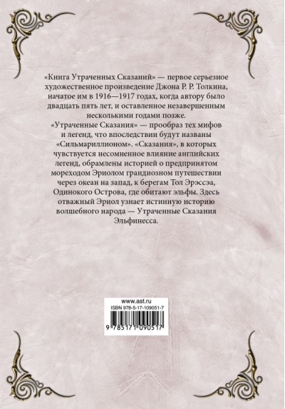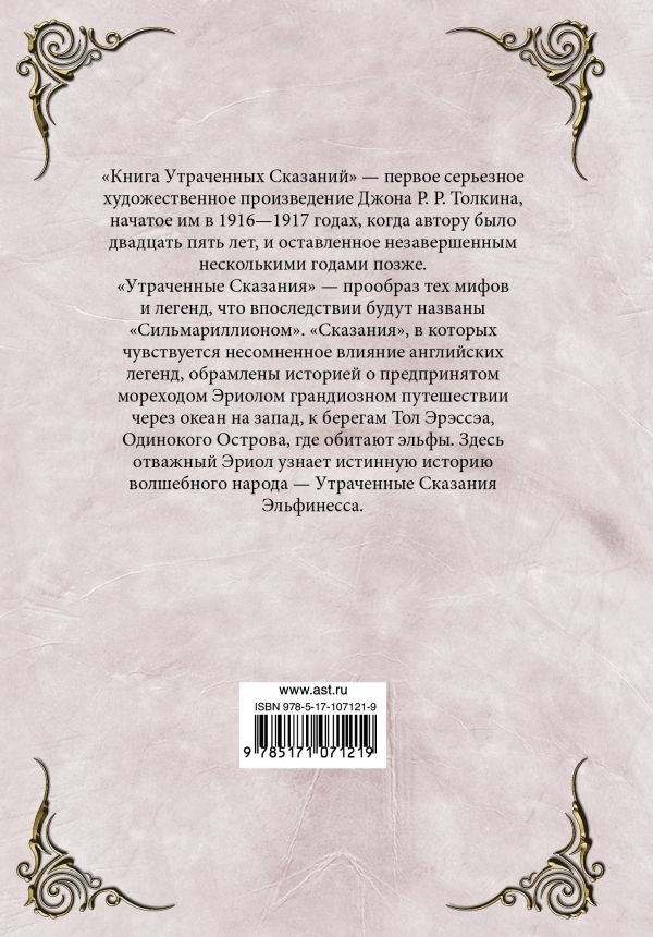 «Книга Утраченных Сказаний» - первое серьезное художественное произведение Джона Р. Р. Толкина, начатое им в 1916-1917 годах, когда автору было двадцать пять лет, и оставленное незавершенным несколькими годами позже. «Утраченные Сказания» - прообраз тех мифов и легенд, что впоследствии будут названы «Сильмариллионом». «Сказания», в которых чувствуется несомненное влияние английских легенд, обрамлены историей о предпринятом мореходом Эриолом грандиозном путешествии через океан на запад, к берегам Тол Эрэссэа, Одинокого Острова, где обитают эльфы. Здесь отважный Эриол узнает истинную историю волшебного народа - Утраченные Сказания Эльфинесса.