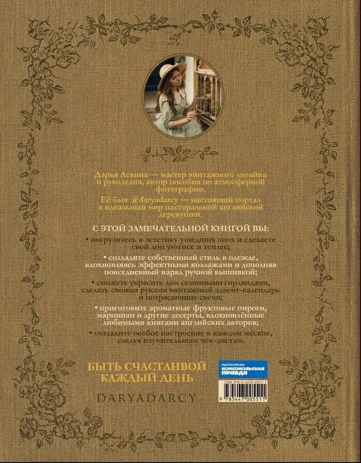 Путешествие в мир красоты! Дарья Левина – мастер винтажного дизайна и рукоделия, автор пособия по атмосферной фотографии. Ее блог @daryadarcy – настоящий портал в идеальный мир пасторальной английской деревушки. С этой замечательной книгой вы: погрузитесь в эстетику ушедших эпох и сделаете свой дом уютнее и теплее; создадите собственный стиль в одежде, вдохновляясь эффектными коллажами и дополняя повседневный наряд ручной вышивкой; сможете украсить дом сезонными гирляндами, сделать своими руками винтажный адвент-календарь и потрясающие свечи; приготовите ароматные фруктовые пироги, марципан и другие десерты, вдохновлённые любимыми книгами английских авторов; создадите особое настроение в каждом месяце, следуя изумительным чек-листам.