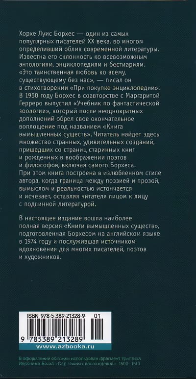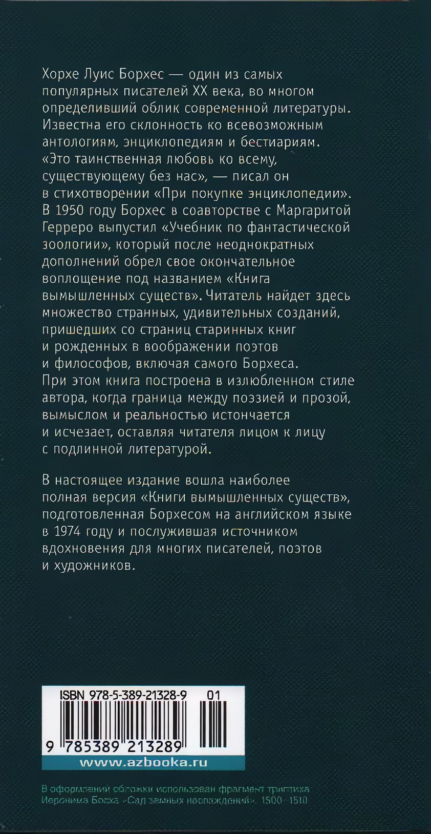 Хорхе Луис Борхес — один из самых популярных писателей ХХ века, во многом определивший облик современной литературы. Известна его склонность ко всевозможным антологиям, энциклопедиям и бестиариям. «Это таинственная любовь ко всему, существующему без нас», — писал он в стихотворении «При покупке энциклопедии». В 1950 году Борхес в соавторстве с Маргаритой Герреро выпустил «Учебник по фантастической зоологии», который после неоднократных дополнений обрел свое окончательное воплощение под названием «Книга вымышленных существ». Читатель найдет здесь множество странных, удивительных созданий, пришедших со страниц старинных книг и рожденных в воображении поэтов и философов, включая самого Борхеса. При этом книга построена в излюбленном стиле автора, когда граница между поэзией и прозой, вымыслом и реальностью истончается и исчезает, оставляя читателя лицом к лицу с подлинной литературой. В настоящее издание вошла наиболее полная версия «Книги вымышленных существ», подготовленная Борхесом на английском языке в 1974 году и послужившая источником вдохновения для многих писателей, поэтов и художников.