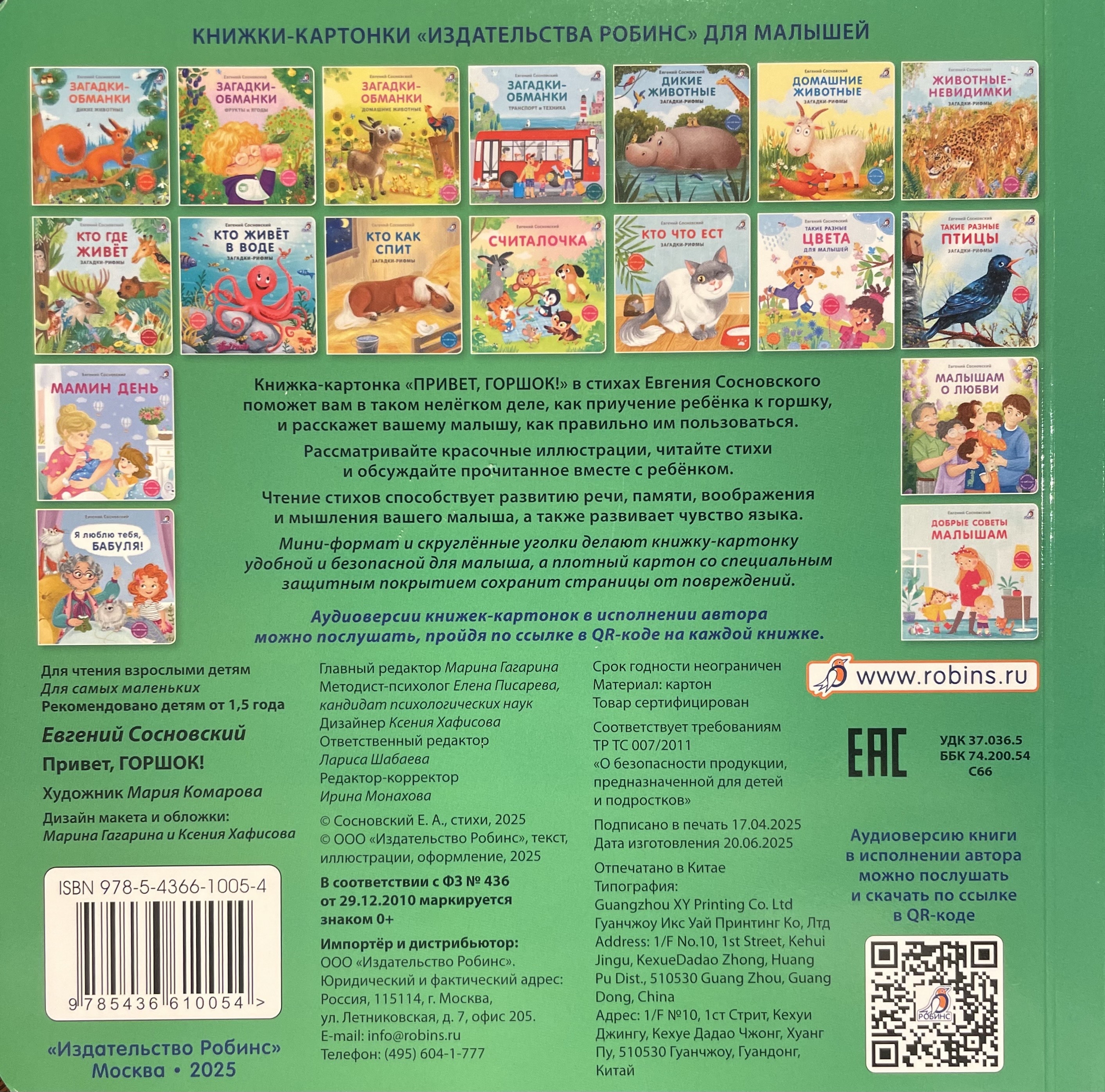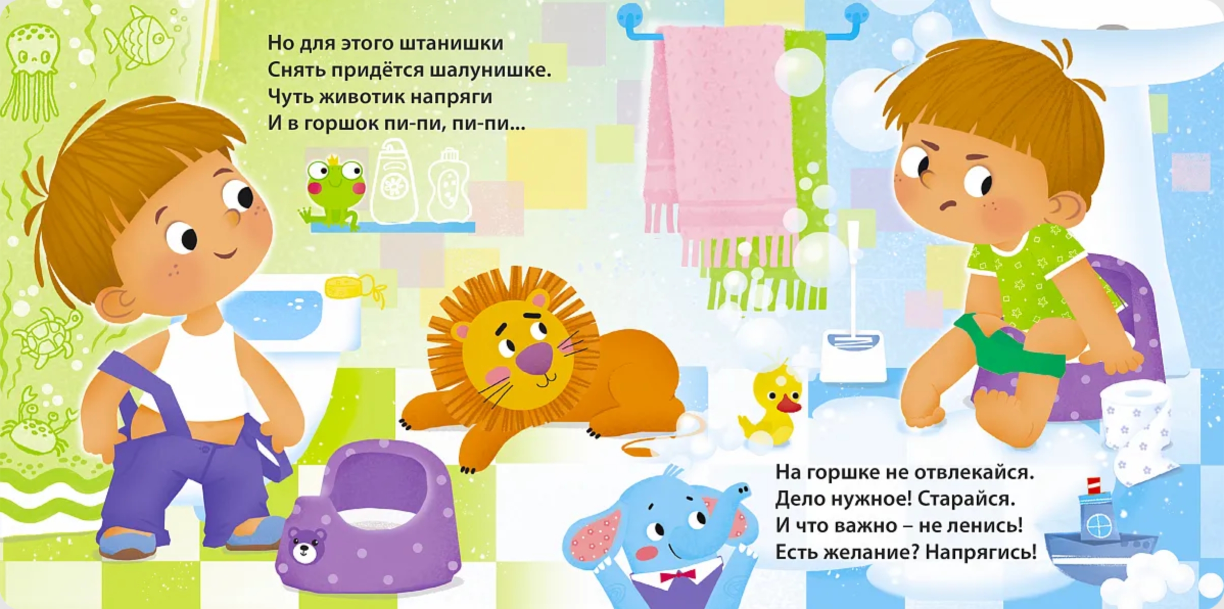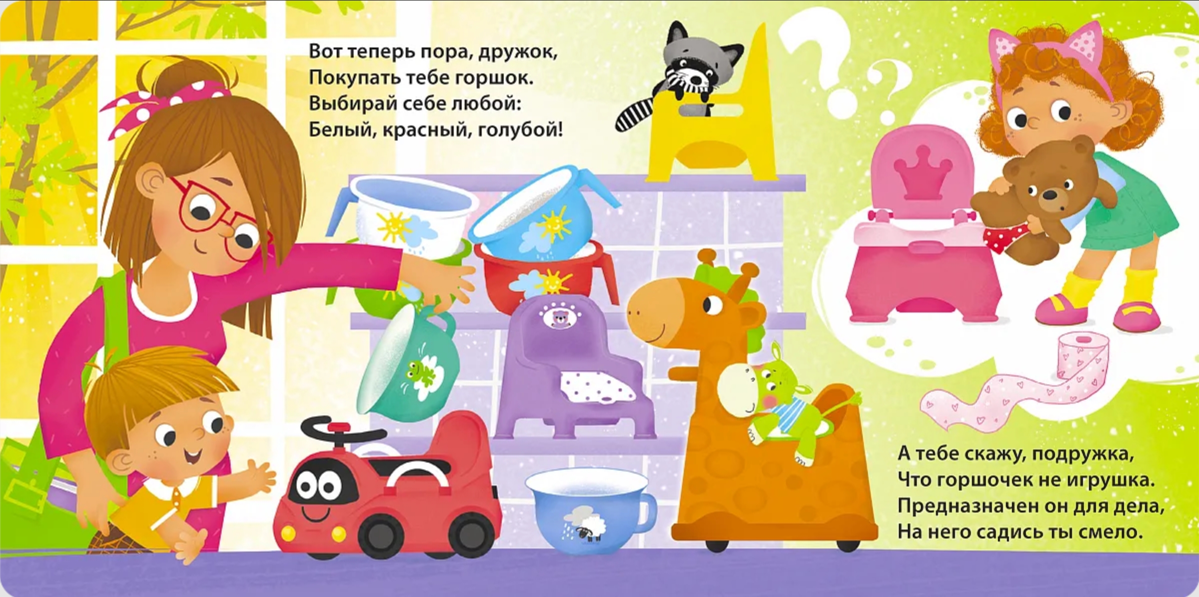 Книжка-картонка «Привет, горшок!» в стихах Евгения Сосновского поможет вам в таком нелёгком деле, как приучение ребёнка к горшку, и расскажет вашему малышу, как правильно им пользоваться. Рассматривайте красочные иллюстрации, читайте стихи и обсуждайте прочитанное вместе с ребёнком.
