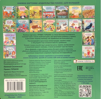 - Мини-формат и скруглённые уголки делают книжку-картонку удобной и безопасной для малыша, а плотный картон со специальным защитным покрытием сохранит страницы от повреждений.