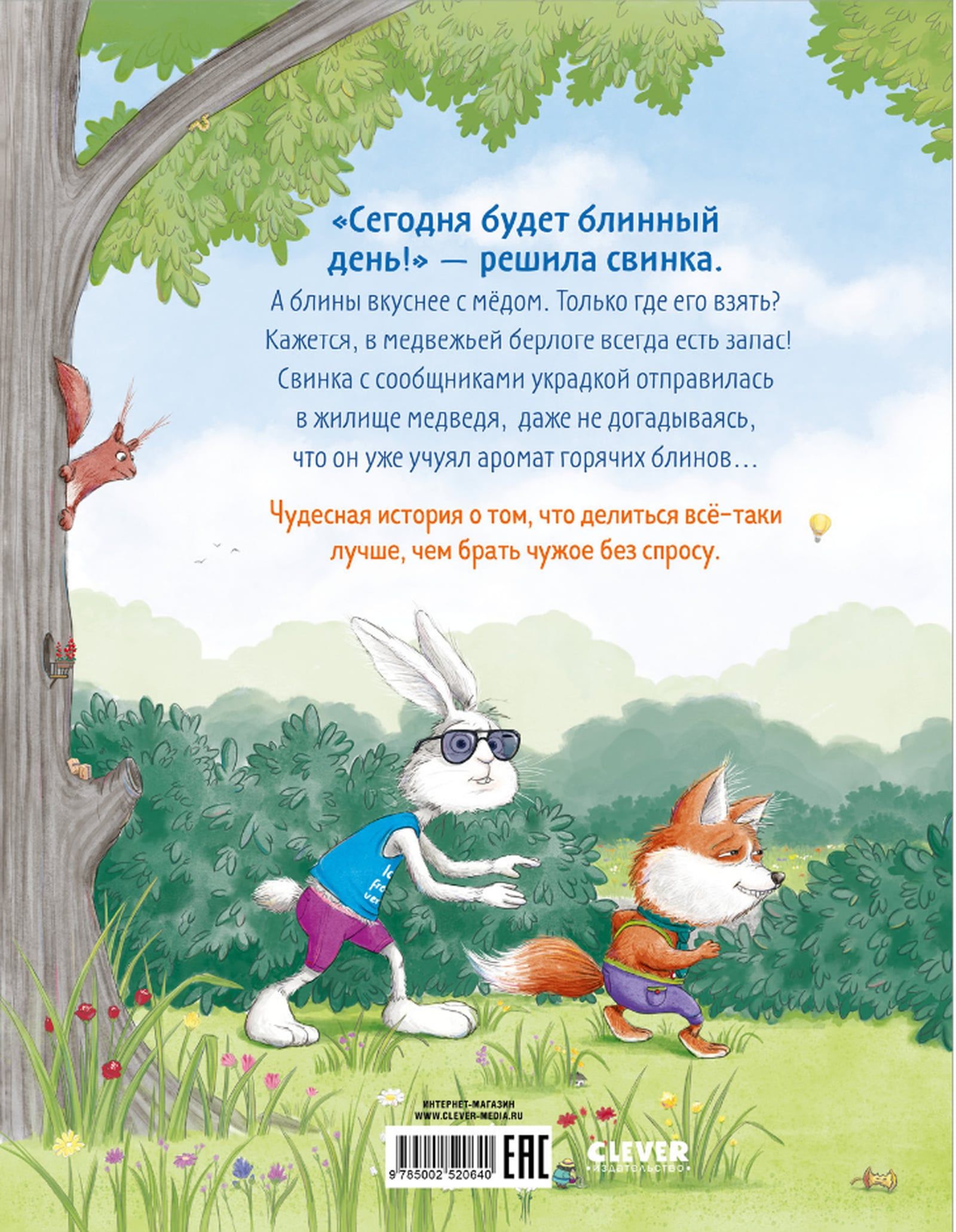 Свинка напекла блинов и решила взять немного меда у медведя… не спросив хозяина. А медведь решил стащить у свинки блины. По дороге друзья-воришки встретились! Что же произошло дальше? К счастью, все закончилось хорошо! Обязательно обсудите с детьми, как важно спрашивать разрешения, когда хочешь позаимствовать что-то у друзей.