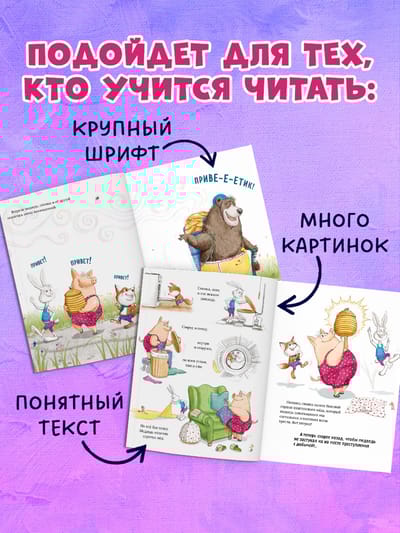 Книга с крупным шрифтом, понятным текстом и большими красивыми картинками подойдет для чтения в детском саду и для первого самостоятельного чтения ребятам постарше.