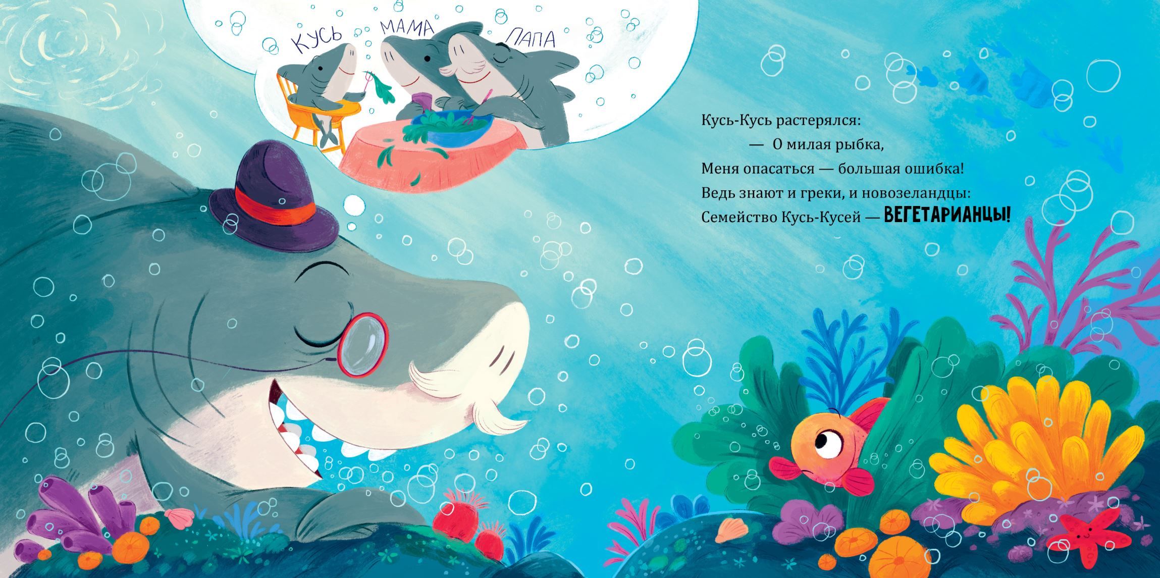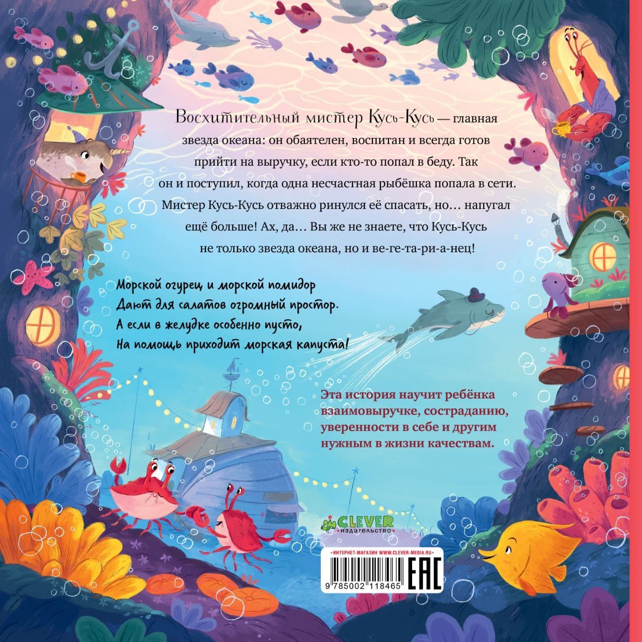 Восхитительный мистер Кусь-Кусь — главная звезда океана: он обаятелен, воспитан и всегда готов прийти на выручку, если кто-то попал в беду. Так он и поступил, когда одна несчастная рыбешка попала в сети. Мистер Кусь-Кусь отважно ринулся ее спасать, но… напугал еще больше! Ах, да… Вы же не знаете, что Кусь-Кусь не только звезда океана, но и ве-ге-та-ри-а-нец.