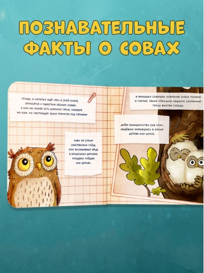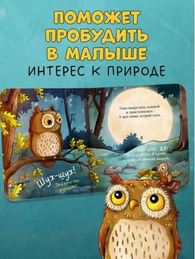 В конце книжки есть познавательный разворот с интересными фактами о совах: что они делают днем, где живут, как выглядят их птенцы? «Совушка в лесу. Первая книга малыша о природе» из прочного картона с закругленными уголками создана специально для маленьких детских ручек. Книжка-картонка станет вашим верным спутником дома, на прогулке и в путешествии!