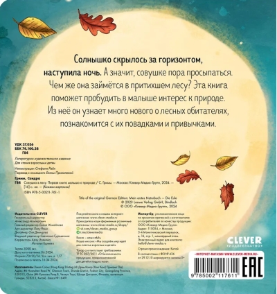 Солнышко скрылось за горизонтом, наступила ночь. А значит, совушке пора просыпаться. Чем же она займется в притихшем лесу? Из этой яркой книжки малыш узнает много нового о лесных обитателях, познакомится с их повадками и привычками.