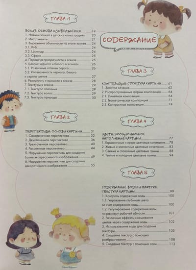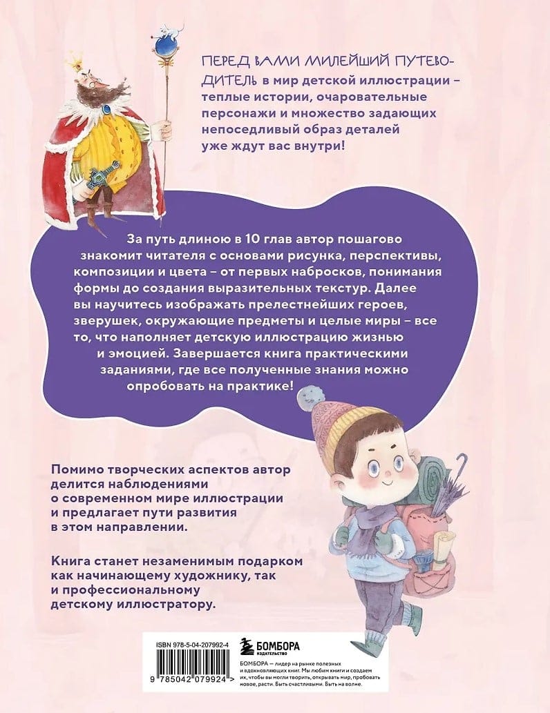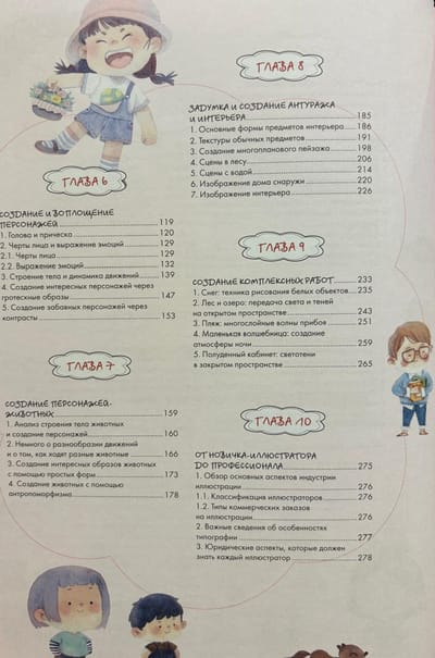 На протяжении 10 глав автор шаг за шагом знакомит с ключевыми основами рисования: формой, перспективой, композицией и цветом — от первых набросков до выразительных текстур. Вы научитесь придумывать и рисовать милых персонажей, зверушек, предметы окружения и целые миры — все, что делает детскую иллюстрацию эмоциональной и откликающейся.