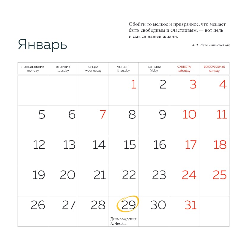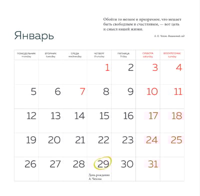 Тщательно подобранные иллюстрации, напечатанные на глянцевой бумаге высочайшего качества, станут настоящим украшением дома, а в календарной сетке найдется место для ваших планов: большие клетки позволят делать записи и организовать свой год.