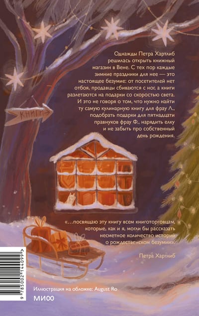 Однажды Петра Хартлиб неожиданно для самой себя открыла книжный магазин в Вене. И вот прошло 15 лет, магазин процветает, но покой его владельцам только снится. В канун новогодних праздников от посетителей нет отбоя, кругом громоздятся горы книг, продавцы сбиваются с ног, а ведь еще нужно найти ту самую кулинарную книгу для фрау Л., подобрать подарки для пятнадцати правнуков фрау Ф., нарядить елку и не забыть про собственный день рождения.