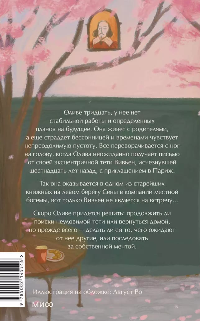 Оливе тридцать, у нее нет стабильной работы и определенных планов на будущее. Она живет с родителями, а еще страдает бессонницей и временами чувствует непреодолимую пустоту. Все переворачивается с ног на голову, когда Олива неожиданно получает письмо от своей эксцентричной тети Вивьен, исчезнувшей шестнадцать лет назад, с приглашением в Париж. Так она оказывается в одном из старейших книжных на левом берегу Сены в компании местной богемы, вот только Вивьен не является на встречу… Скоро Оливе придется решить — продолжить ли поиски неуловимой тети или вернуться домой, но прежде всего — делать ли ей то, чего ожидают от нее другие, или последовать за собственной мечтой.