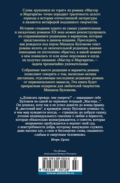 Слова «рукописи не горят» из романа «Мастер и Маргарита» точно передают трагичность целого периода в истории отечественной литературы и являются метафорой подлинного творчества. Историю создания одного из самых удивительных и загадочных романов ХХ века можно реконструировать по сохранившимся редакциям и вариантам, которые представлены в данном издании. Проследить, как рождался под пером Михаила Булгакова текст романа вплоть до окончательной редакции, какими эпизодами он постепенно обрастал, в какой момент в нем появились те или иные персонажи и когда он получил название «Мастер и Маргарита» — задача чрезвычайно увлекательная. Собранные вместе редакции и варианты романа позволяют говорить о том, насколько велика дистанция, отделяющая последнюю редакцию романа от первоначального замысла. Эта книга будет прекрасным подарком для любителей творчества Михаила Булгакова.