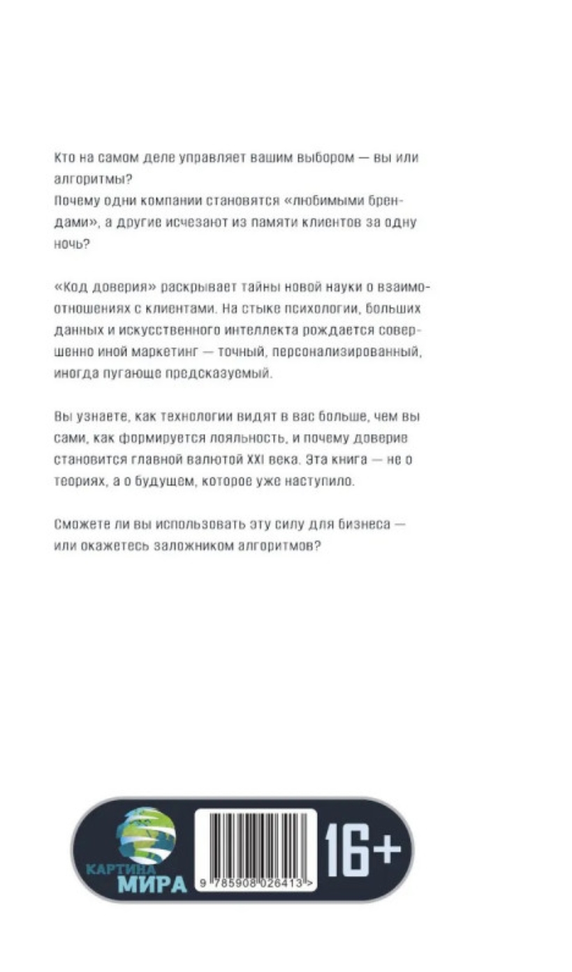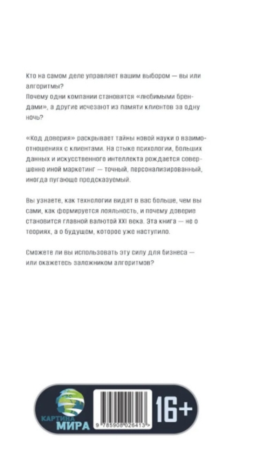 Кто на самом деле управляет вашим выбором: вы или алгоритмы? Почему одни компании становятся любимыми брендами, а другие исчезают из памяти клиентов за одну ночь? Код доверия раскрывает тайны новой науки о взаимоотношениях с клиентами.