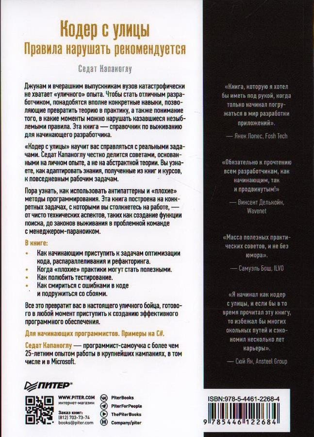 «Кодер с улицы» научит вас справляться с реальными задачами. Седат Капаноглу честно делится советами, основанными на личном опыте, а не на абстрактной теории. Вы узнаете, как адаптировать знания, полученные из книг и курсов, к повседневным рабочим задачам. Пора узнать, как использовать антипаттерны и «плохие» методы программирования. Эта книга построена на конкретных задачах, с которыми вы столкнетесь на работе, — от чисто технических аспектов, таких как создание функции поиска, до законов выживания в проблемной команде с менеджером-параноиком. Все это превратит вас в настоящего уличного бойца, готового в любой момент приступить к созданию эффективного программного обеспечения.