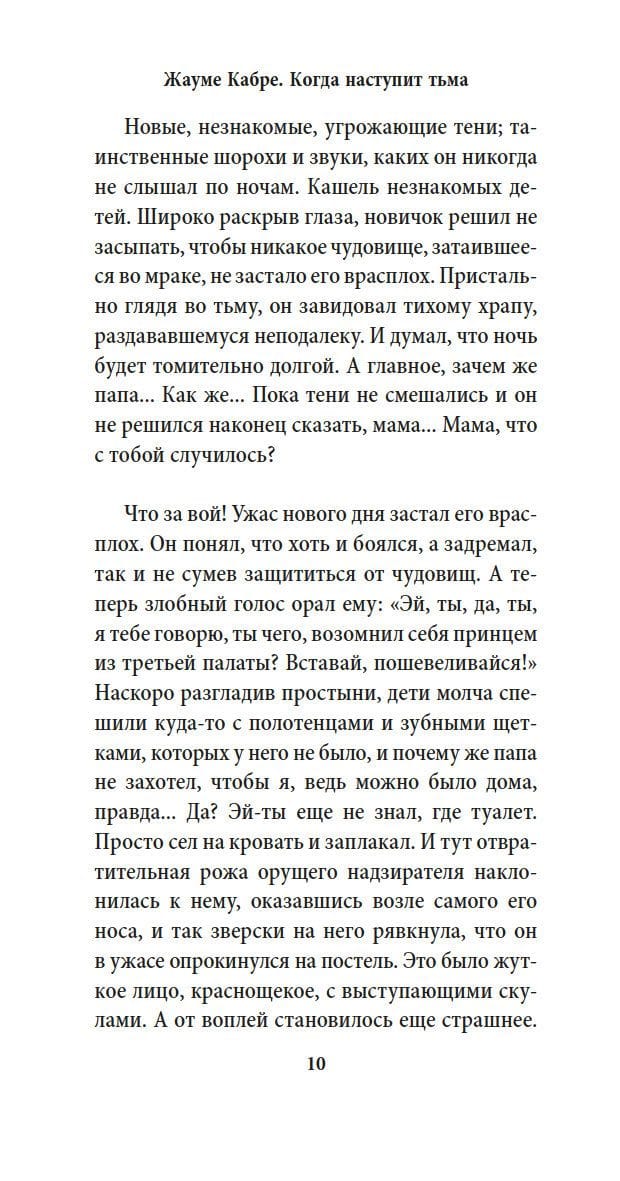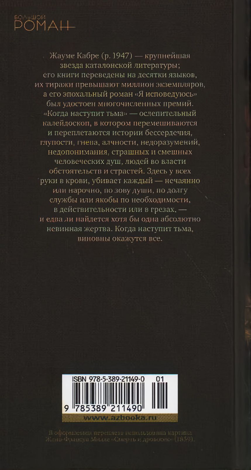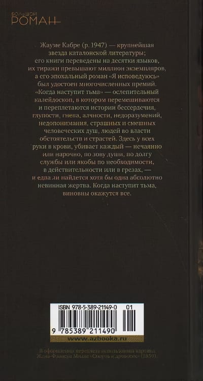 Один воспитанник сиротского приюта вырастает и мстит всем, кто его бросил. Одного изощренного вора крадет картина, которую он украл. Одна книга смотрит с полки на то, как один будущий нобелевский лауреат сходит с ума в день своего долгожданного триумфа. Один писатель сочиняет роман и грозит издателю покончить с собой, если книгу не напечатают. Один бывший солдат, уже совершенно лишившись рассудка, все не может забыть проигранную битву и гибель товарищей на поле боя.... Жауме Кабре (р. 1947) — крупнейшая звезда каталонской литературы; его книги переведены на десятки языков, их тиражи превышают миллион экземпляров, а его эпохальный роман «Я исповедуюсь» был удостоен многочисленных премий. «Когда наступит тьма» — ослепительный калейдоскоп, в котором перемешиваются и переплетаются истории бессердечия, глупости, гнева, алчности, недоразумений, недопонимания, страшных и смешных человеческих душ, людей во власти обстоятельств и страстей. Здесь у всех руки в крови, убивает каждый — нечаянно или нарочно, по зову души, по долгу службы или якобы по необходимости, в действительности или в грезах, — и едва ли найдется хотя бы одна абсолютно невинная жертва. Когда наступит тьма, виновны окажутся все.