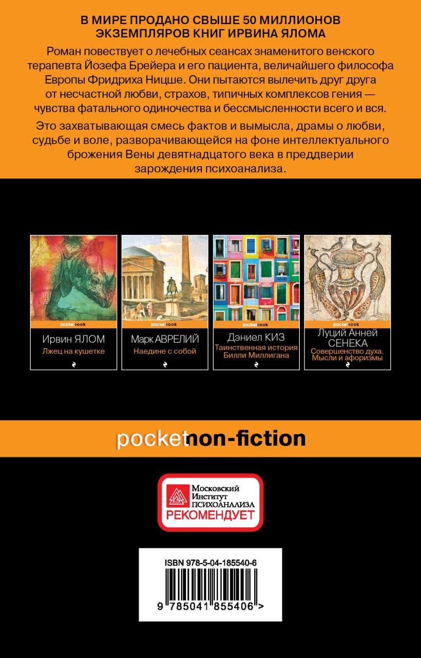 Незаурядный пациент... Талантливый лекарь, терзаемый мучениями... Тайный договор. Соединение этих элементов порождает незабываемую сагу будто бы имевших место взаимоотношений величайшего философа Европы (Ф. Ницше) и одного из отцов-основателей психоанализа (Й. Брейера).