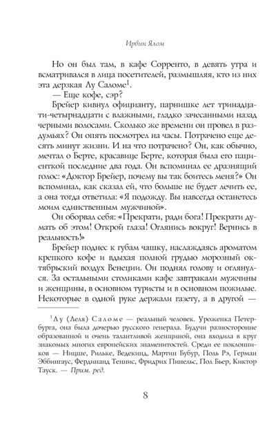Ялом втягивает в действие не только Ницше и Брейера, но и Лу Саломе, «Анну О.» и молодого медика-интерна Зигмунда Фрейда.
