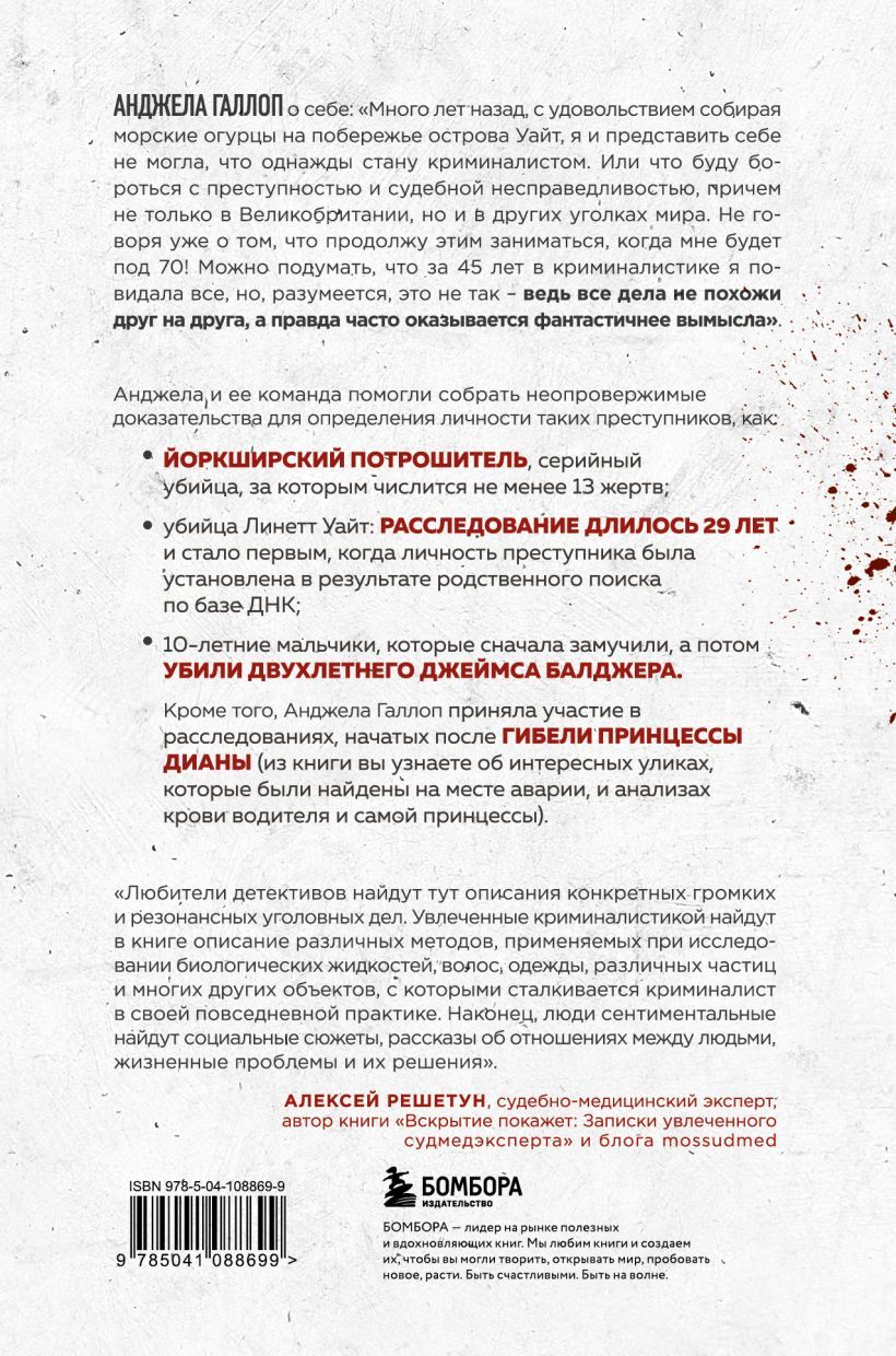 Какие следы вы бы стали искать на грузовике, в котором транспортировали краденое? После прочтения этой книги вы будете знать ответ на этот вопрос. Ее автор, Анджела Галлоп, самый востребованный криминалист Великобритании, специалист по нераскрытым делам, рассказывает о том, как ведется работа по раскрытию преступлений. Анджела утверждает, что на каждом месте преступления есть улики, самое сложное — это найти их и аккуратно собрать: кровь, ДНК, осколки стекла, пыльцу и многое другое. Во время чтения становится ясно, насколько сложна криминалистика: чтобы реконструировать ход совершения преступления и раскрыть правду о том, что на самом деле произошло, специалистам необходимо не просто быть предельно внимательными к деталям, но также уметь мыслить нестандартно.